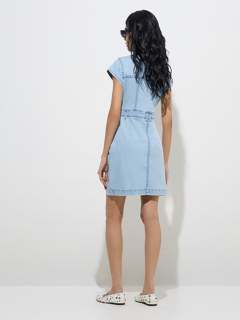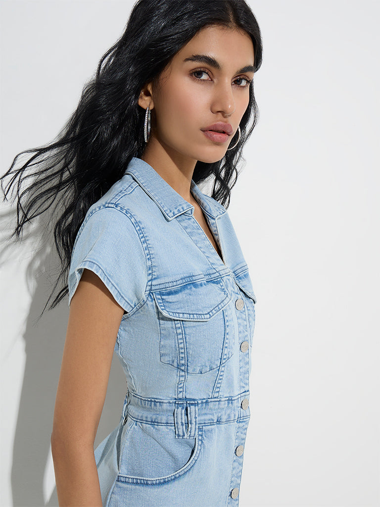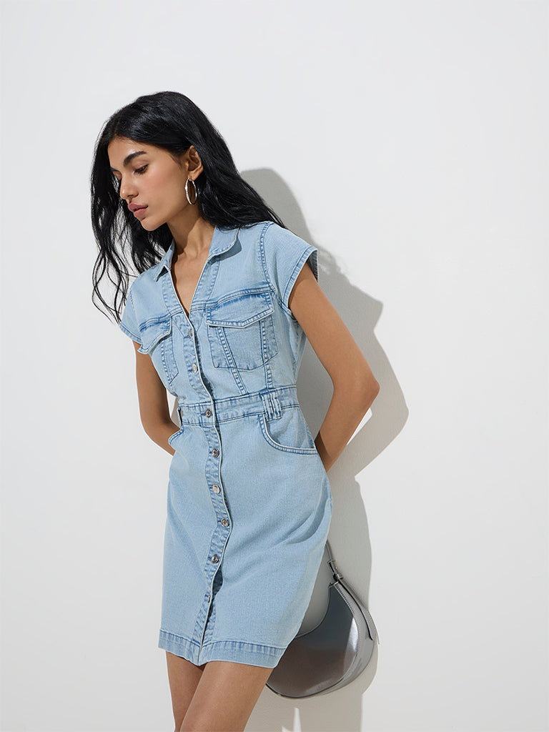 Nuon introduces this blue bodycon denim dress. crafted from a soft and stretchable cotton-blend fabric for a flattering fit. Styled with a collar. button-down front. and capped sleeves. it also features belt loops and multiple pockets for added edge and functionality.