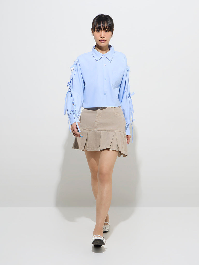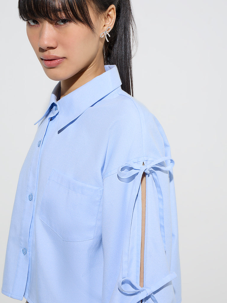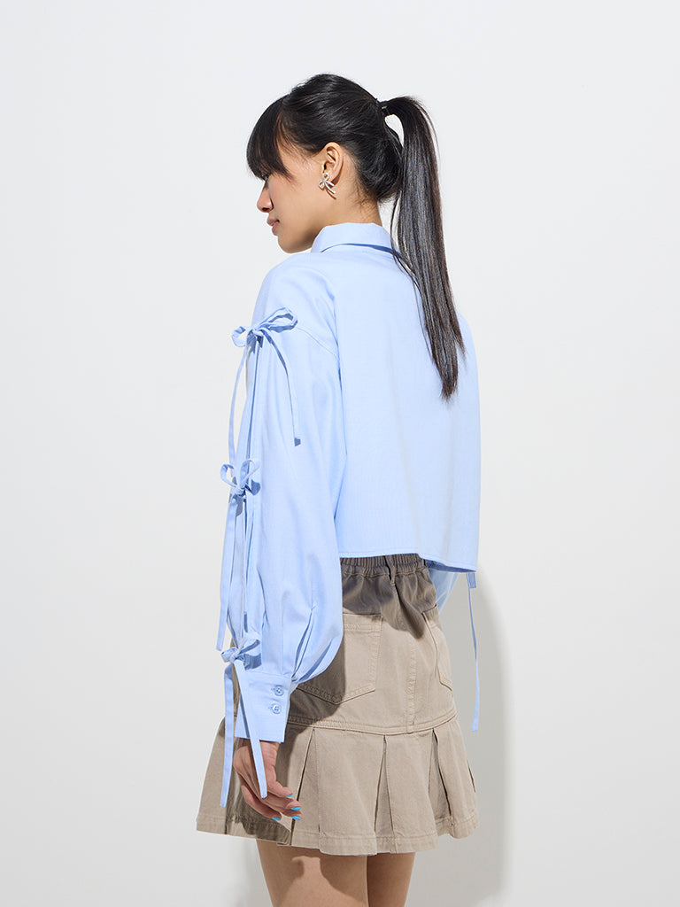 This blue shirt from Nuon is crafted from a cotton-rich blend for a soft yet structured feel. Designed with a sharp collar. button-down front. and a functional chest pocket. it combines classic tailoring with modern flair. The full sleeves. accented with bow details. add a contemporary twist.