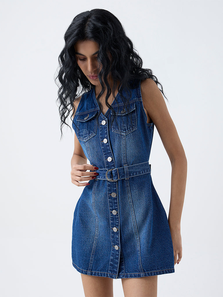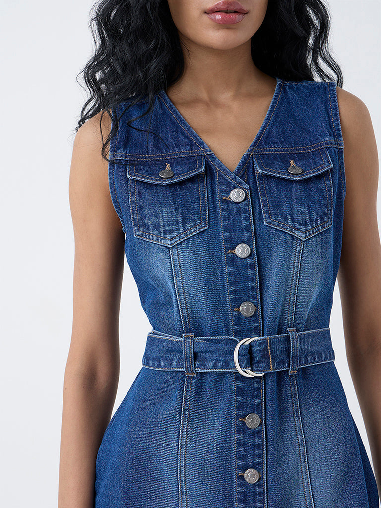 Be the first to review “Nuon Blue Denim A-Line Dress with Belt”