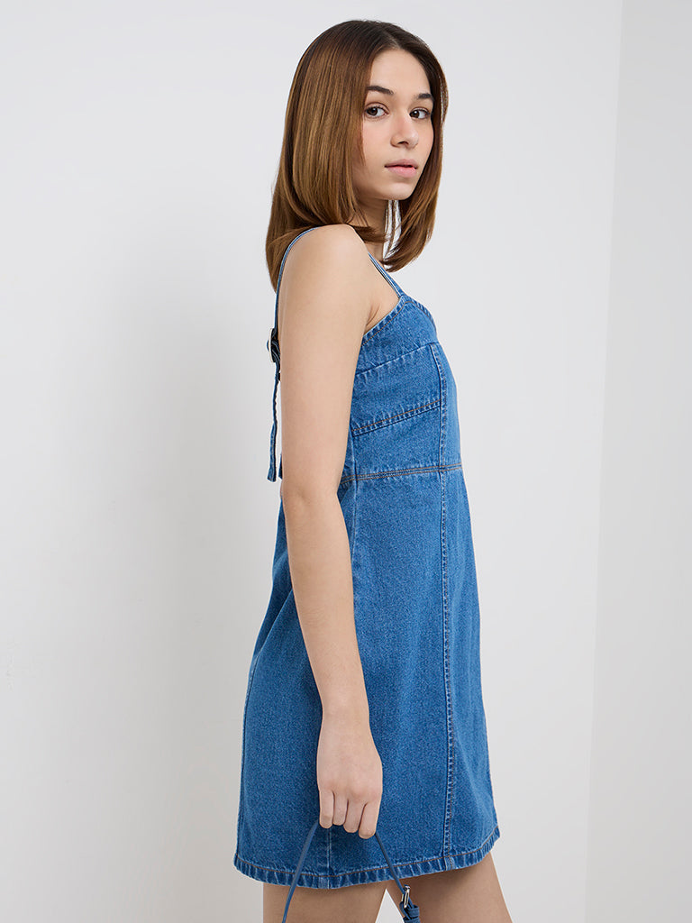 This chic denim dress from Nuon flaunts a cool blue hue in a bodycon silhouette. Crafted from pure cotton material. this denim dress is complemented by a pentagon neckline and adjustable straps.