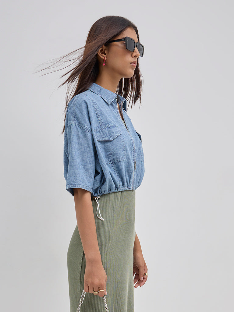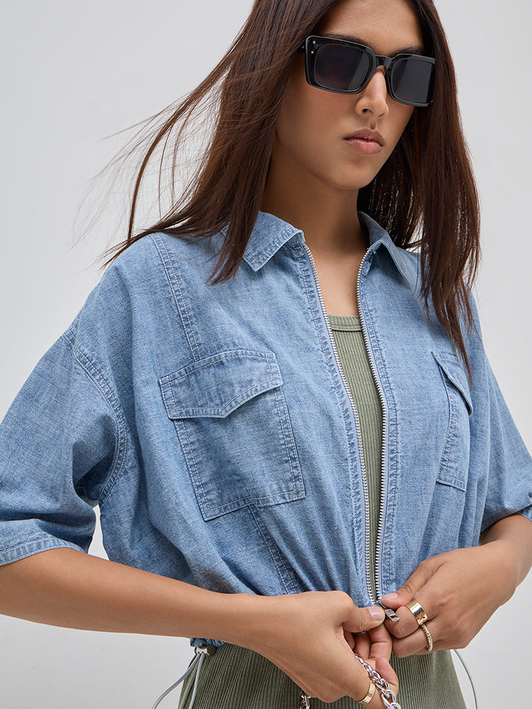 This blue denim jacket by Nuon is created from pure-cotton for uninterrupted comfort. It feature a spread collar that extends to a zipper placket and dropped sleeves. The flap pockets at the front lend a practical finish. while the elasticated waist provides a flattering fit.