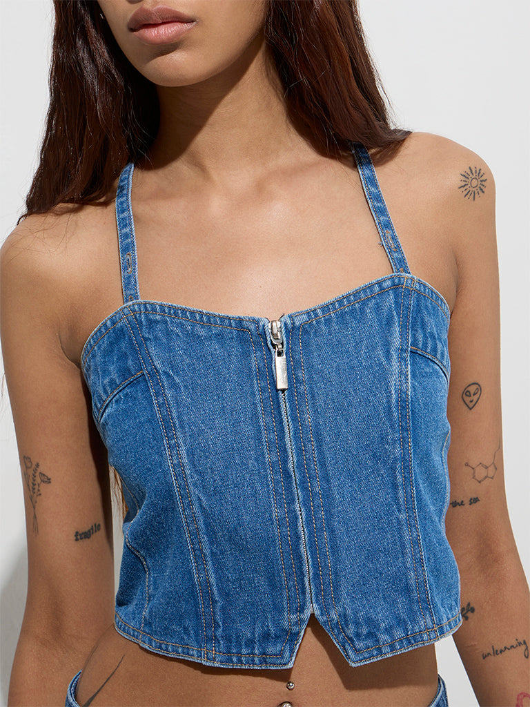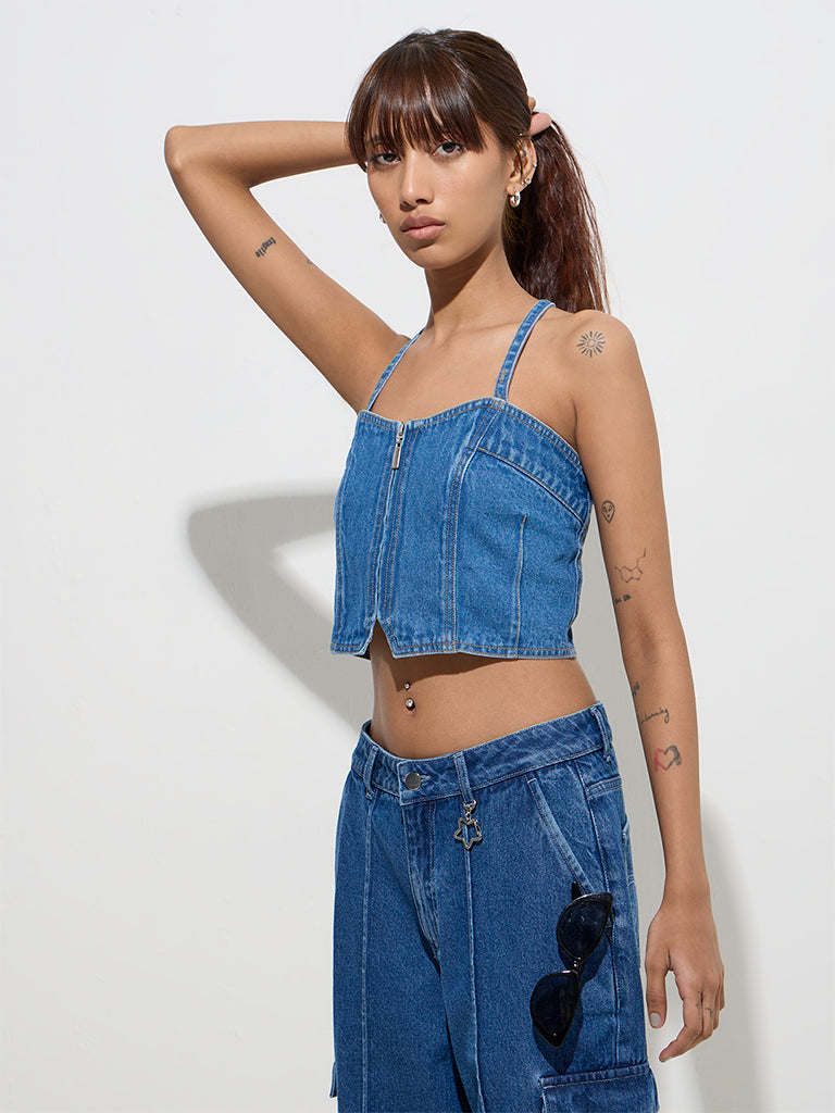 This blue denim top from Nuon is designed with a flattering sweetheart neck. a sleeveless profile and a zipper front for easy wearability. Made from pure cotton fabric. it features a smocked back for added flexibility. making it both comfortable and statement-worthy.