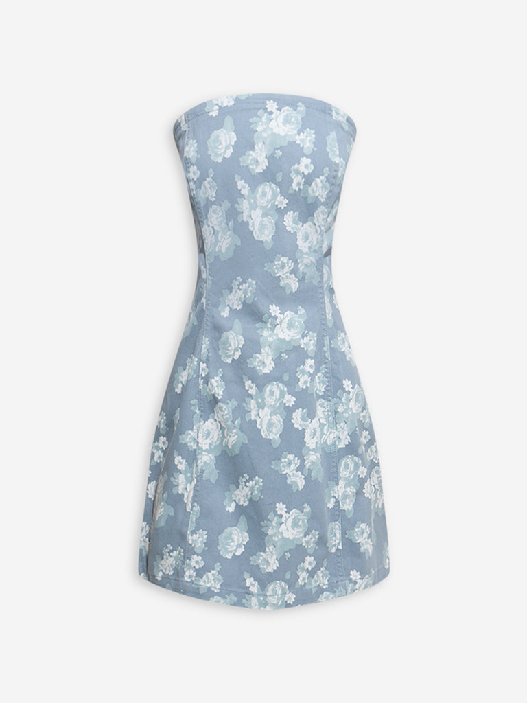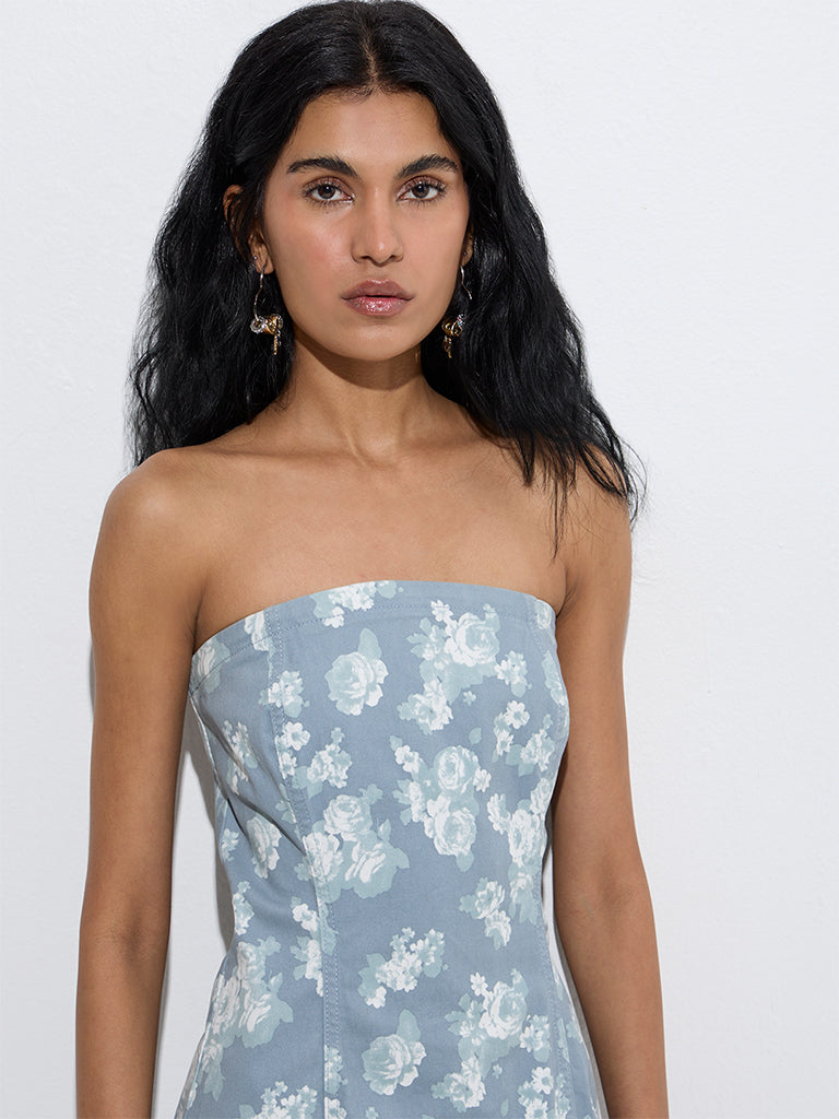 Nuon introduces this blue denim tube dress adorned with floral motifs for a playful yet structured appeal. Created from a rich cotton-blend fabric. it offers a snug fit that’s balanced by a zipper placket at the back for ease of wear.
