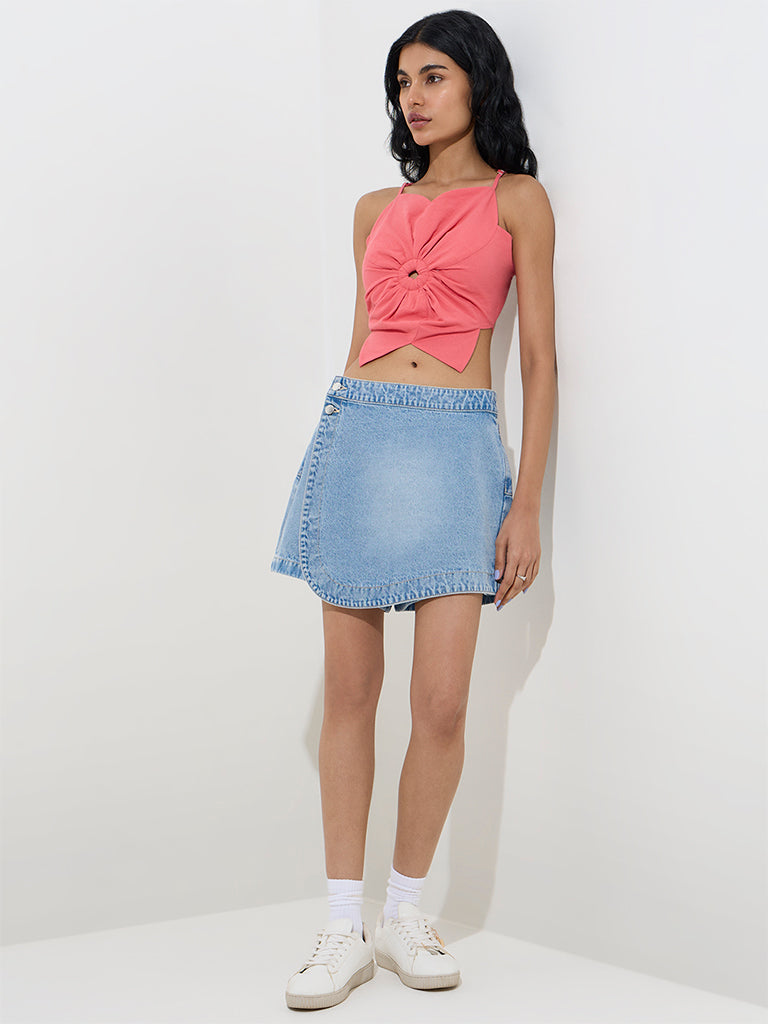 This blue denim skort from Nuon features a high-rise cut. crafted from durable cotton-rich fabric. The flap-over construction is secured with a side button closure. while back pockets enhance practicality. making it a stylish essential for effortless everyday looks.