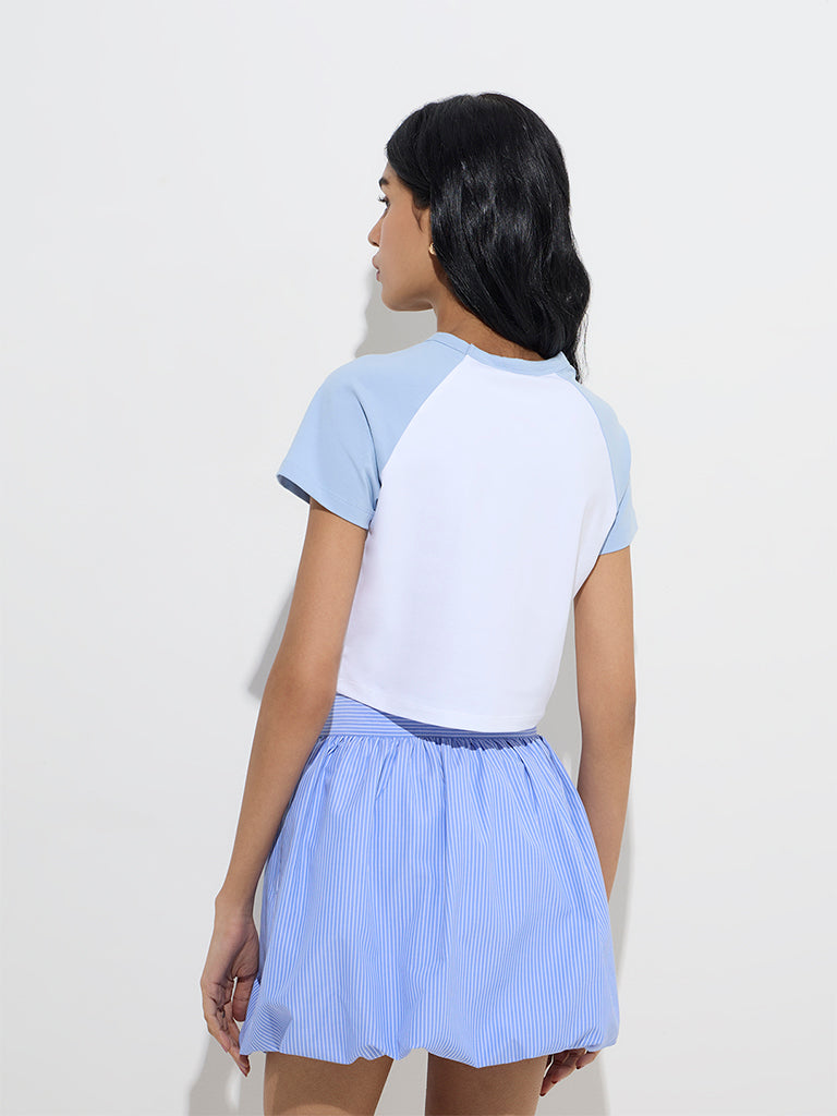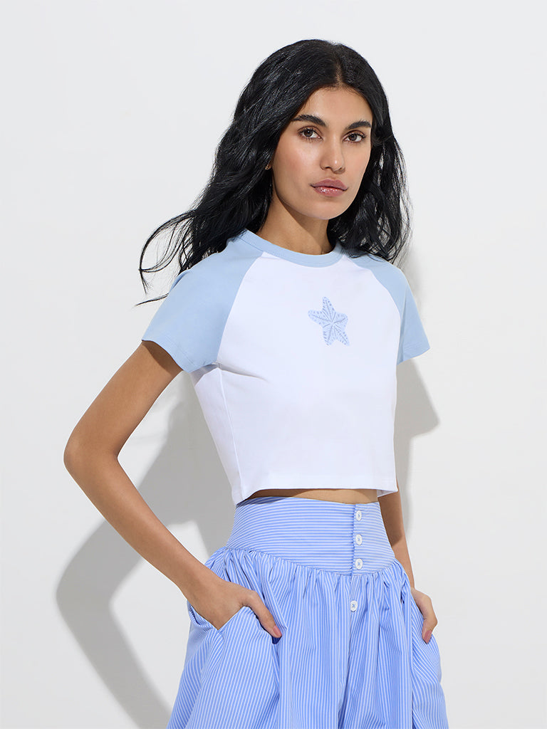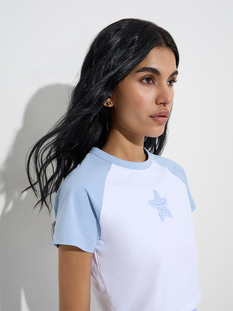 Add a splash of seaside charm to your casual collection with this white tee from Nuon. Made from a premium cotton-blend fabric. it features contrast blue raglan sleeves and a whimsical starfish print that brings a breezy. coastal vibe to your everyday look.