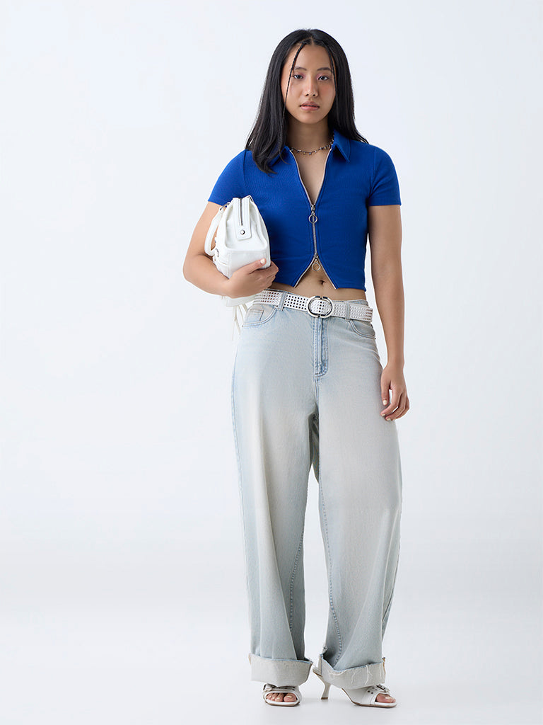 Bring a hint of modernity to your off-duty rotation with this blue t-shirt from Nuon. Crafted in a ribbed profile for a sleek. body-defining fit. it features a spread collar that extends to a zipper placket and short sleeves for a breezy finish.