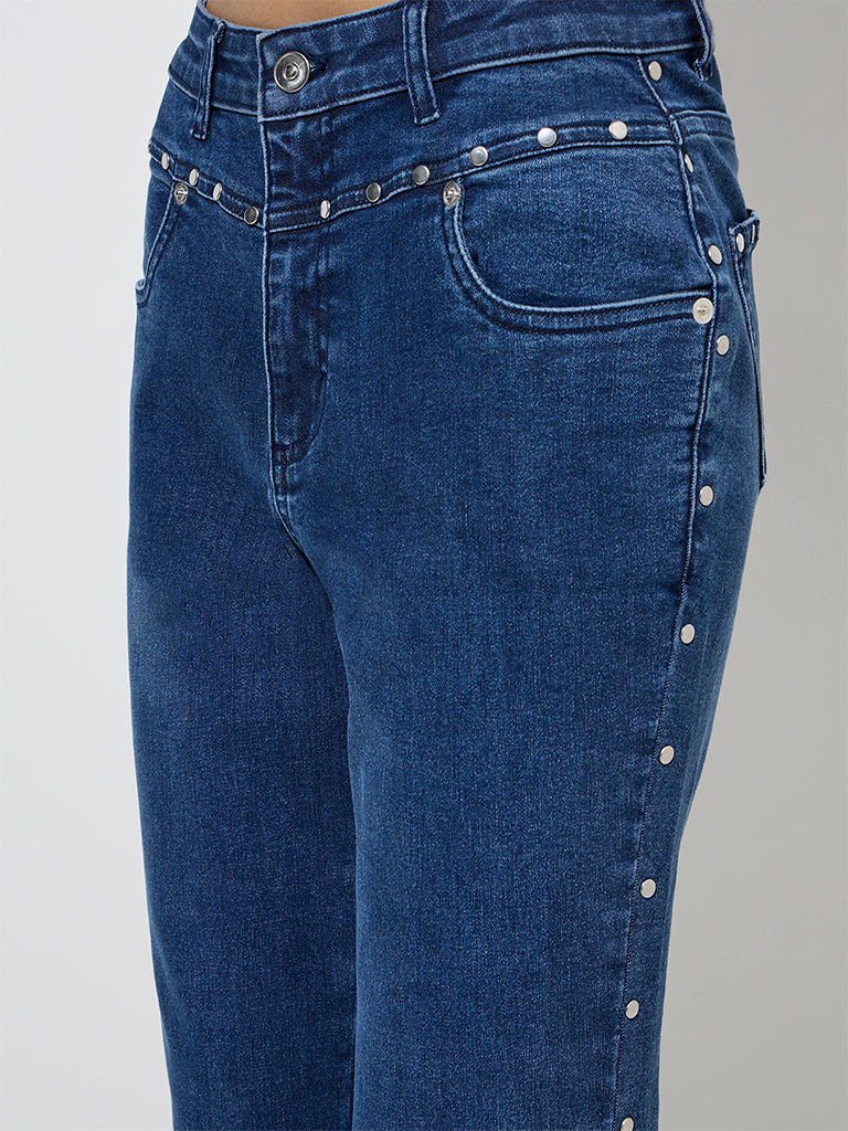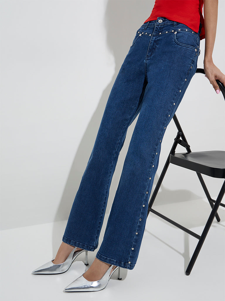 These blue jeans by Nuon are designed with silver-toned stud addition. Made from a cotton-rich blend. the high-rise bottom wear boasts a trendy wide-leg fit silhouette. The smooth buttoned waistband. belt loops. zipper fly and multiple pockets complete this garment.