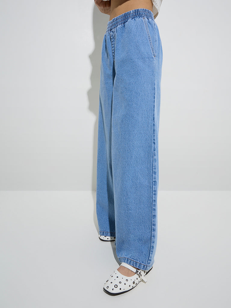 These blue jeans by Nuon flaunt a stylish wide-leg cut. Offering a high-rise fit. the pure cotton garment carries a smooth elastic waistband and multiple pockets.
