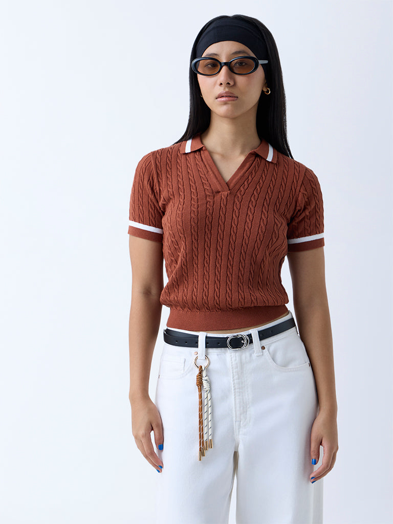 Woven from pure cotton with a cosy cable-knit texture. this brown t-shirt from Nuon blends classic charm with modern flair. The V-neck collar and half sleeves are accented with contrasting stripes. while the elasticated hem offers a comfortable fit.
