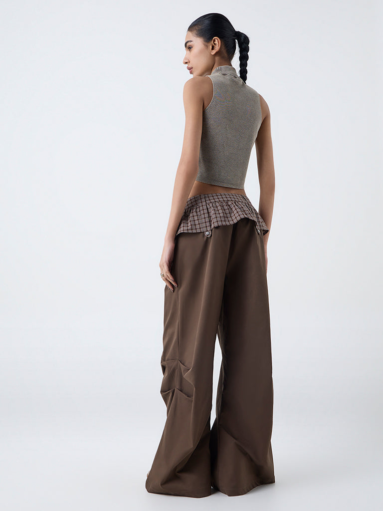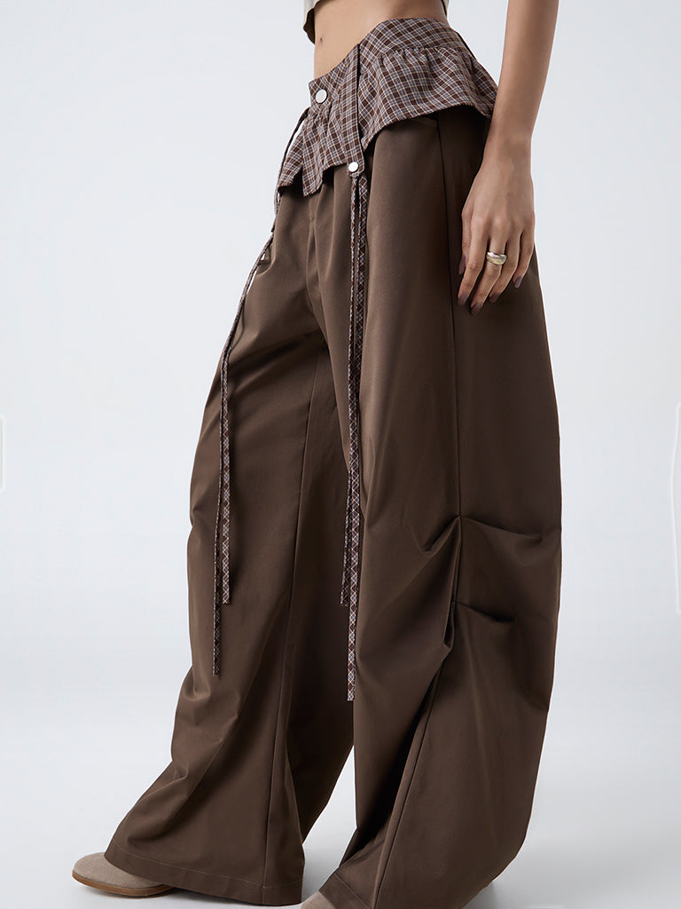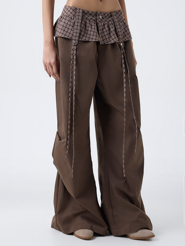 Nuon Brown Check Detailed High-Rise Cotton Pants-Online Exclusive