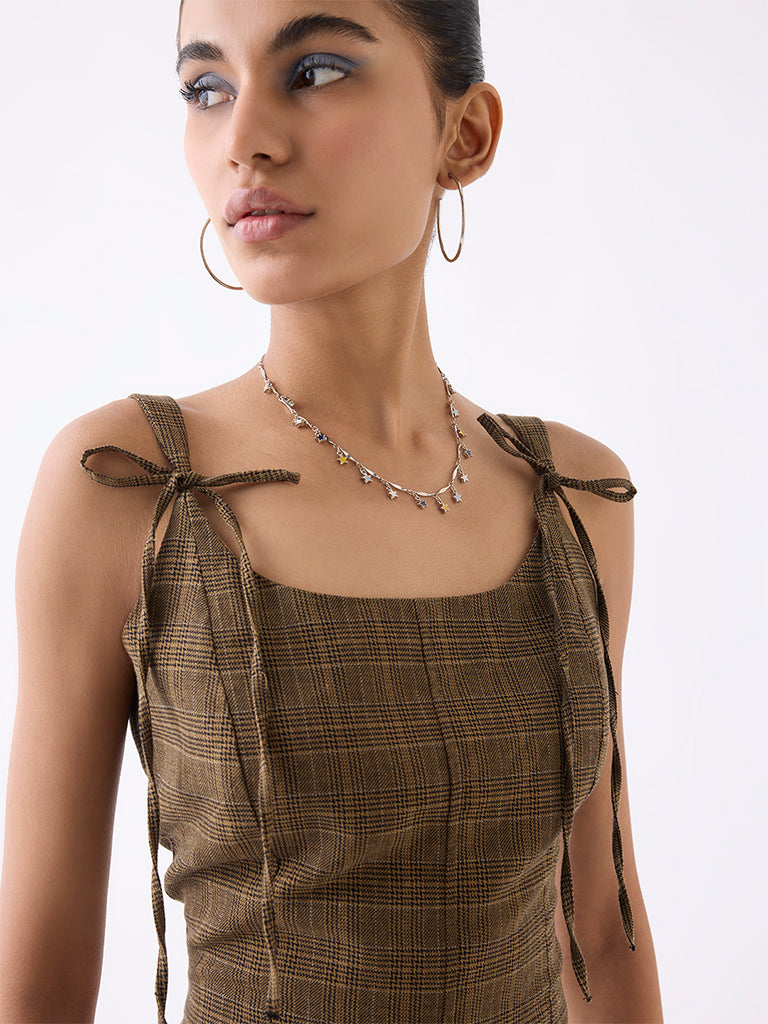 Add a touch of retro charm to your off-duty assortment with this brown top from Nuon. detailed with classic houndstooth checks. Created from an ultra-lightweight fabric. it features a round neck and delicate tie-up accents on the shoulders. while a smocked back ensures a flexible fit.