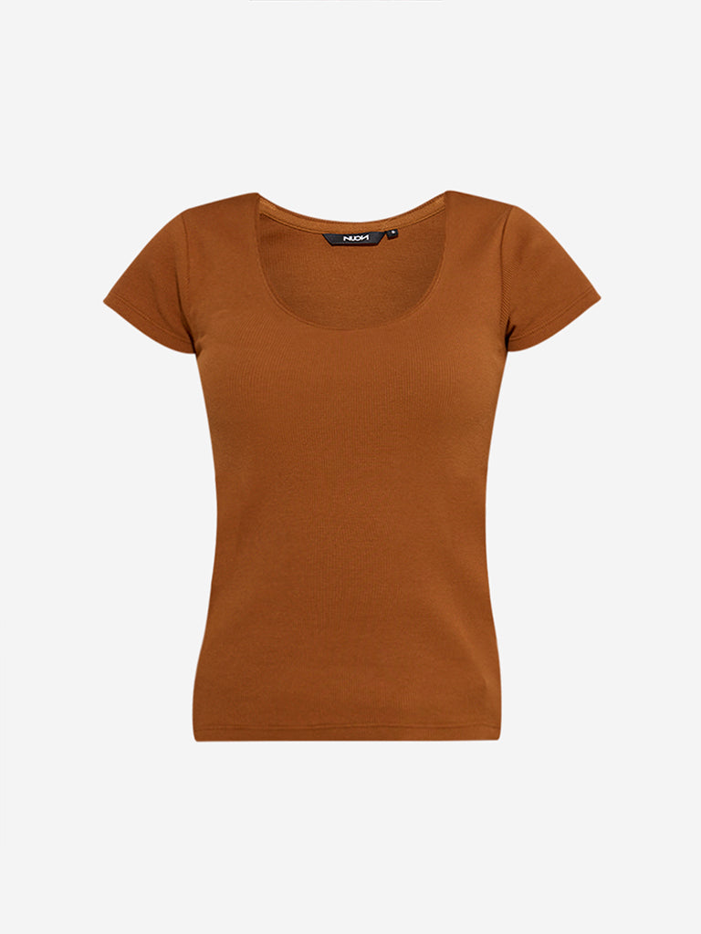 Add a modern staple to your everyday rotation with this brown t-shirt from Nuon. Milled from a cotton-blend fabric with a ribbed texture. it features a scoop neck and short sleeves. offering an easy-going charm that’s perfect for warm-weather styling and contemporary looks.