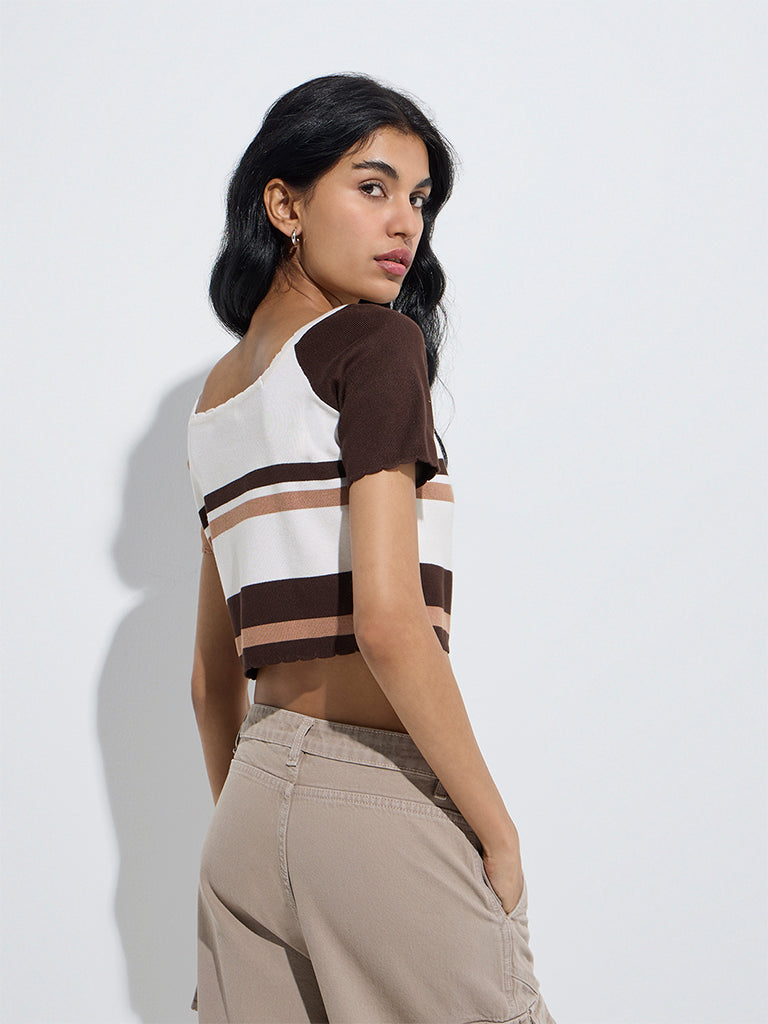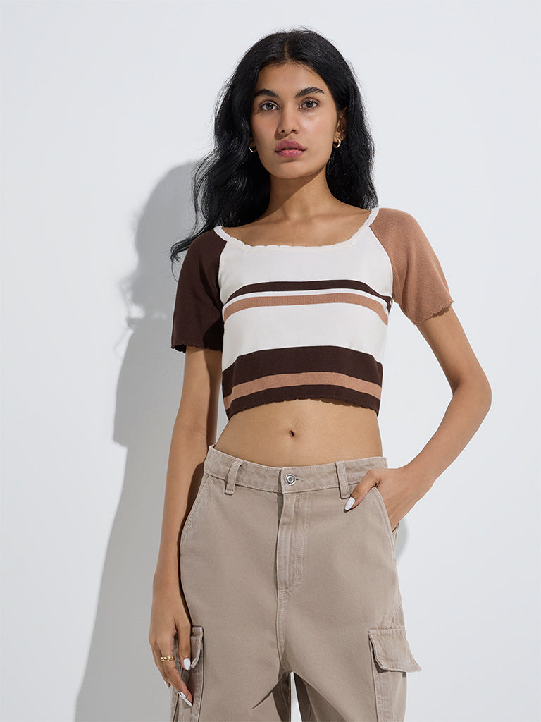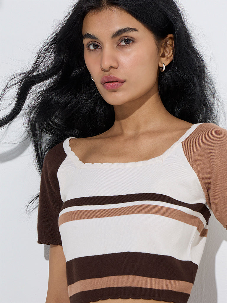 This brown t-shirt from Nuon highlights a stripe design for a contemporary look. Made from a lightweight fabric. it is styled with a scallop-detailed neck and short sleeves for a casual yet distinctive finish.