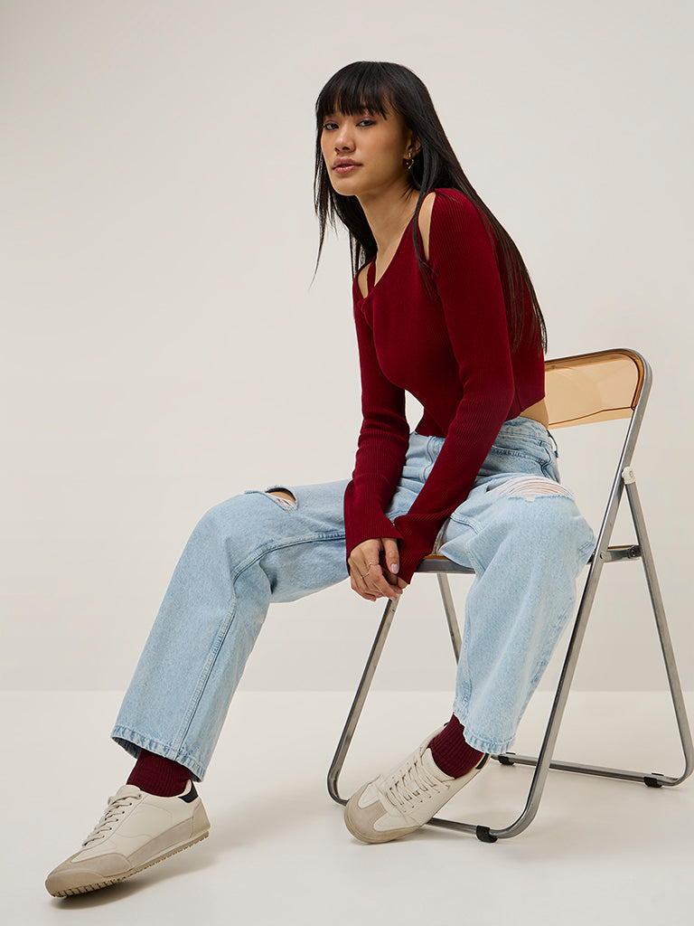 This burgundy top from Nuon is designed with cut-out detailing at the front. Spun from a ribbed-textured fabric. it includes an asymmetrical neckline and full sleeves.