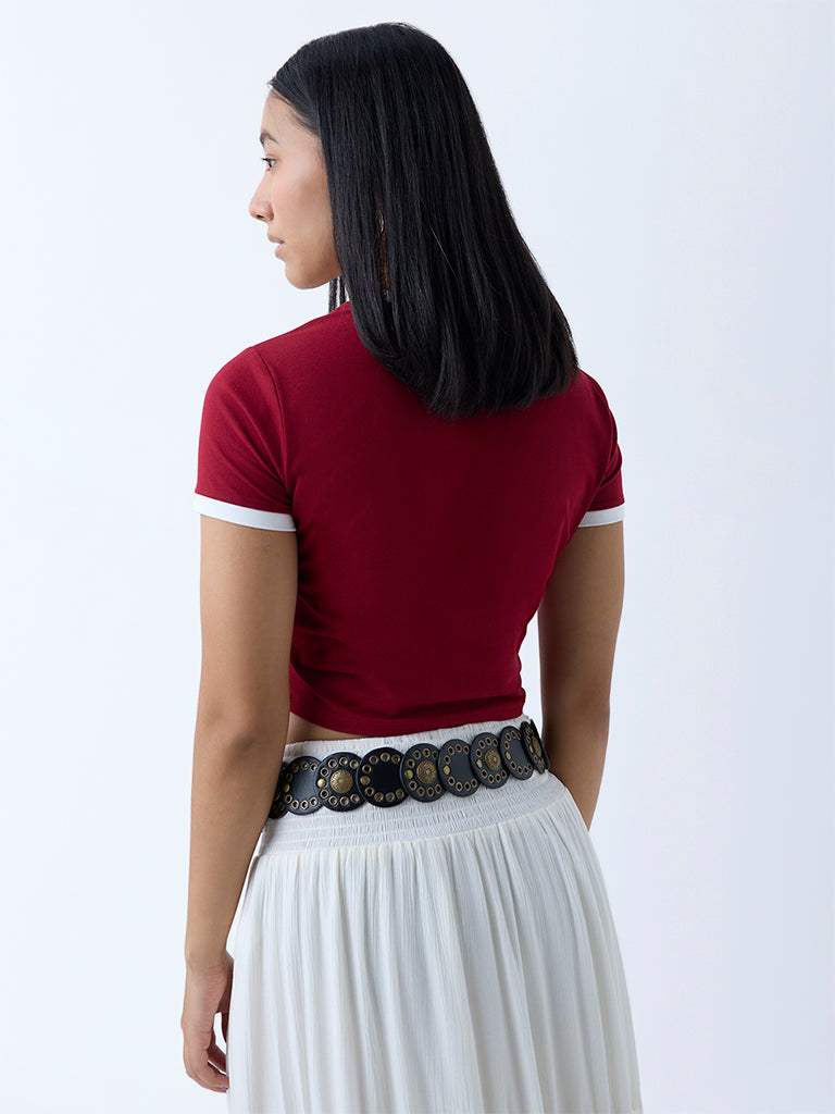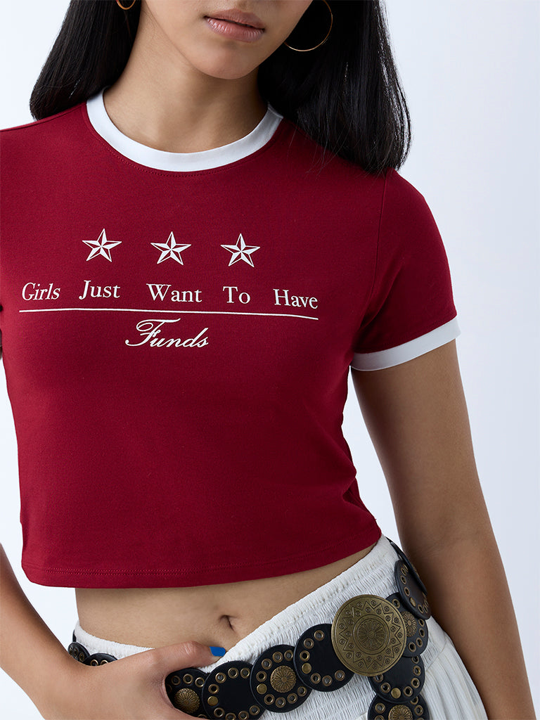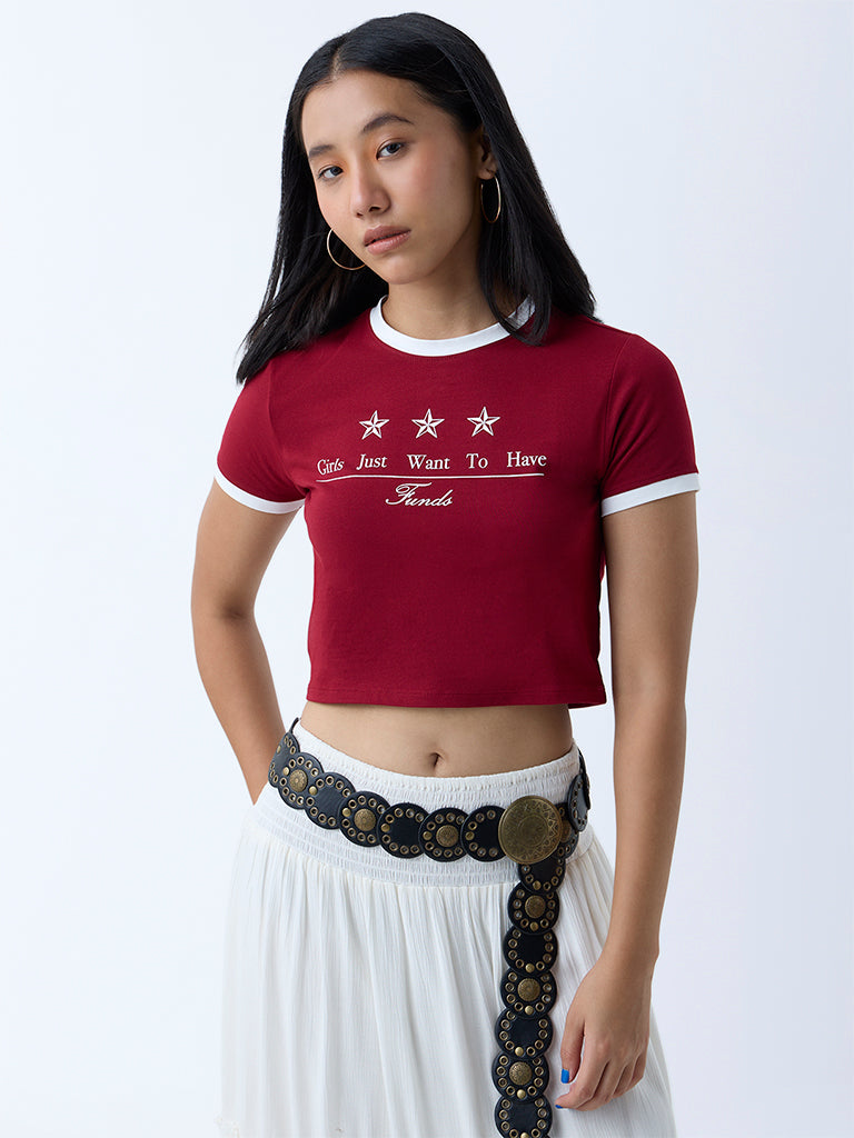 Nuon Burgundy Text Detailed Cotton-Blend T-Shirt