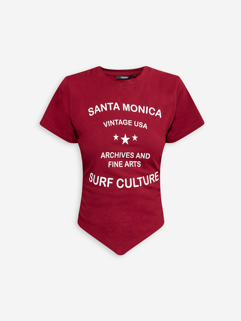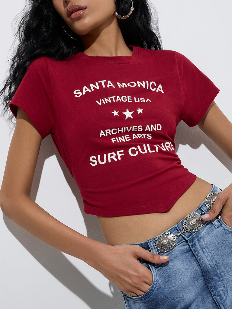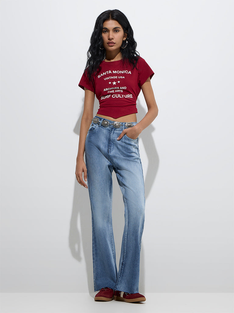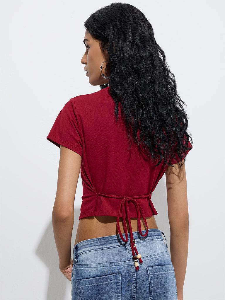 This burgundy tee from Nuon combines casual ease with a hint of flair. Designed with a round neck and short sleeves. it’s elevated by typographic prints that add personality to your look. Crafted from a soft cotton-blend fabric for everyday comfort. it is finished with a tie-up detail at the back for a cinched waist.