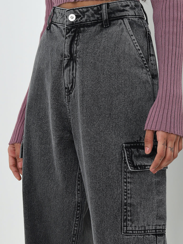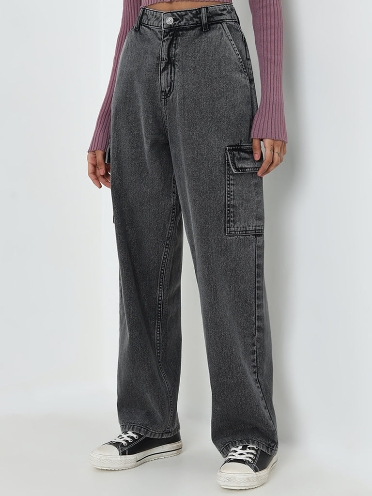 These charcoal cargo jeans by Nuon come in a high-rise style showcasing an enzyme-washed design. Constructed from pure cotton material. the high-rise bottom wear carries buttoned waistband. belt loops. zipper fly and multiple pockets.
