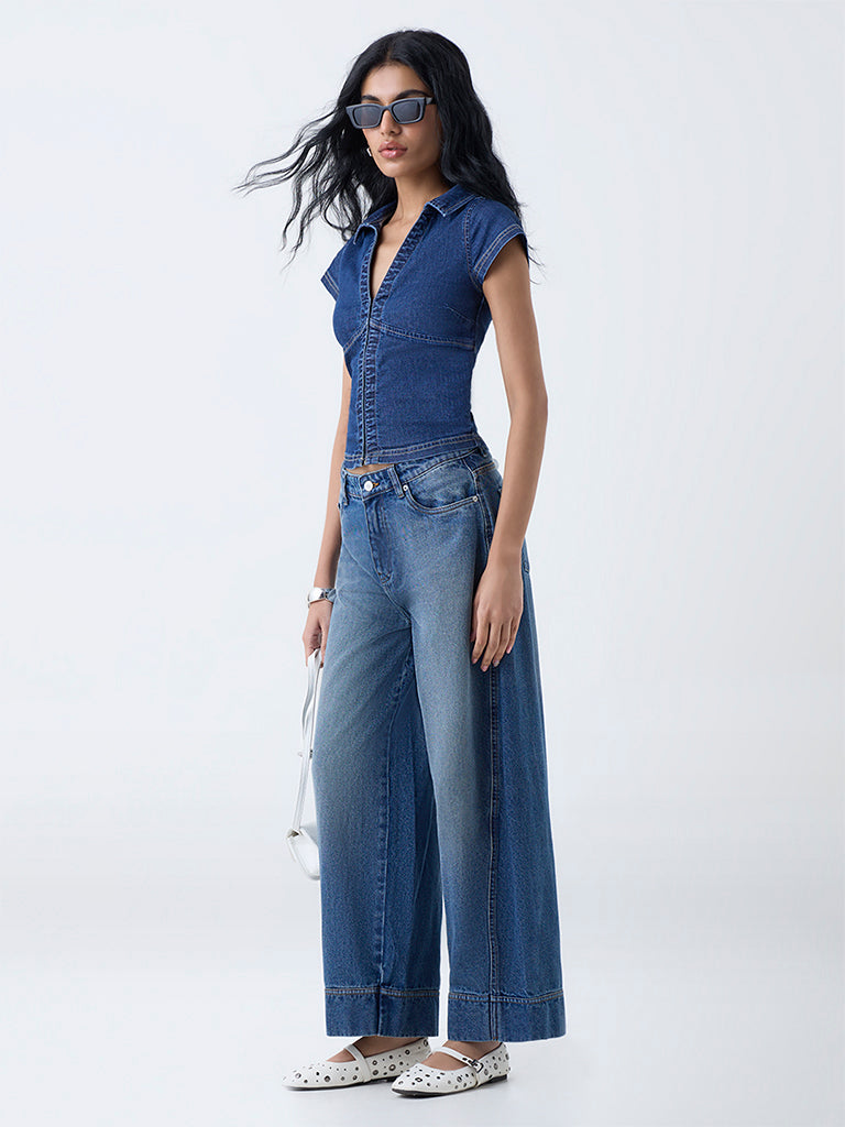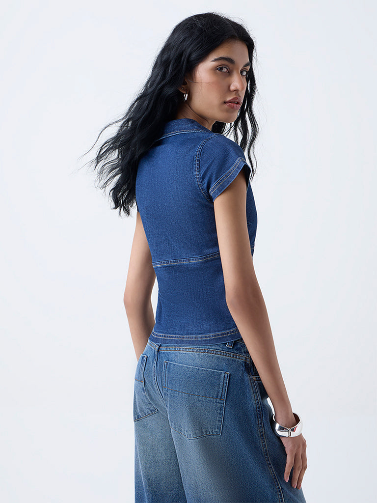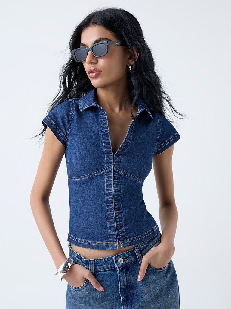 Nuon keeps it sleek with this dark blue denim top. Constructed from a cotton-blend fabric for everyday comfort. it’s styled with a clean V-neck collar and cap sleeves for a versatile finish.