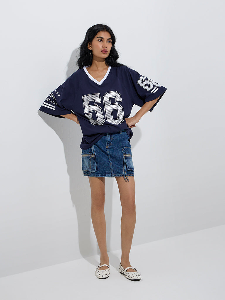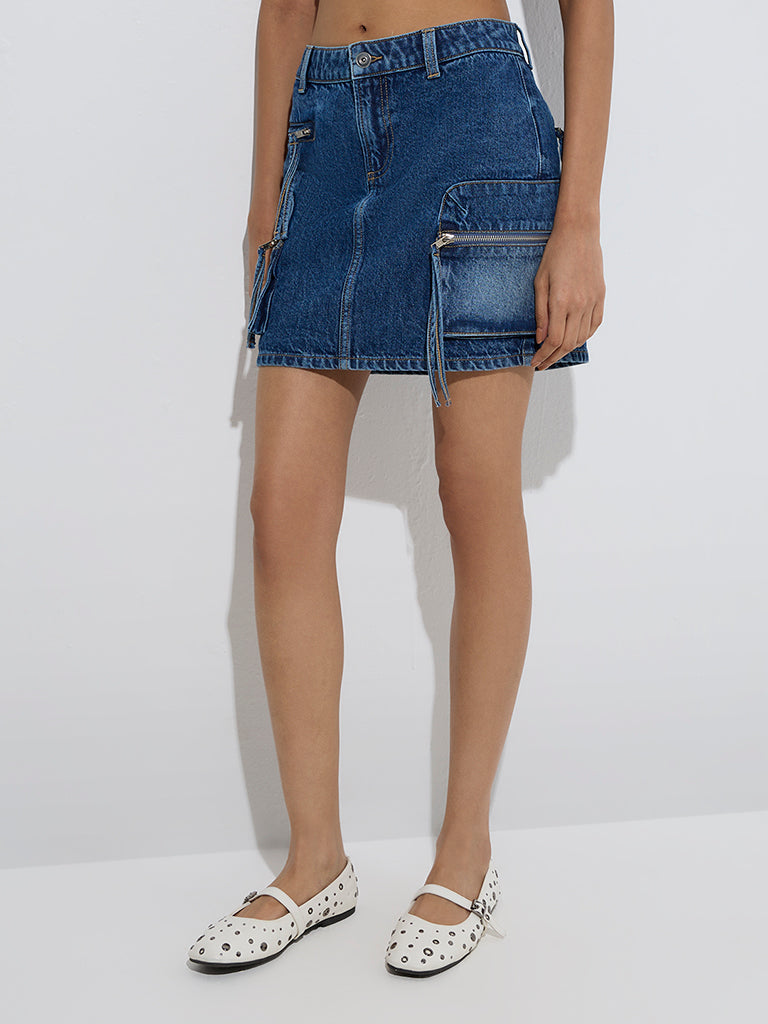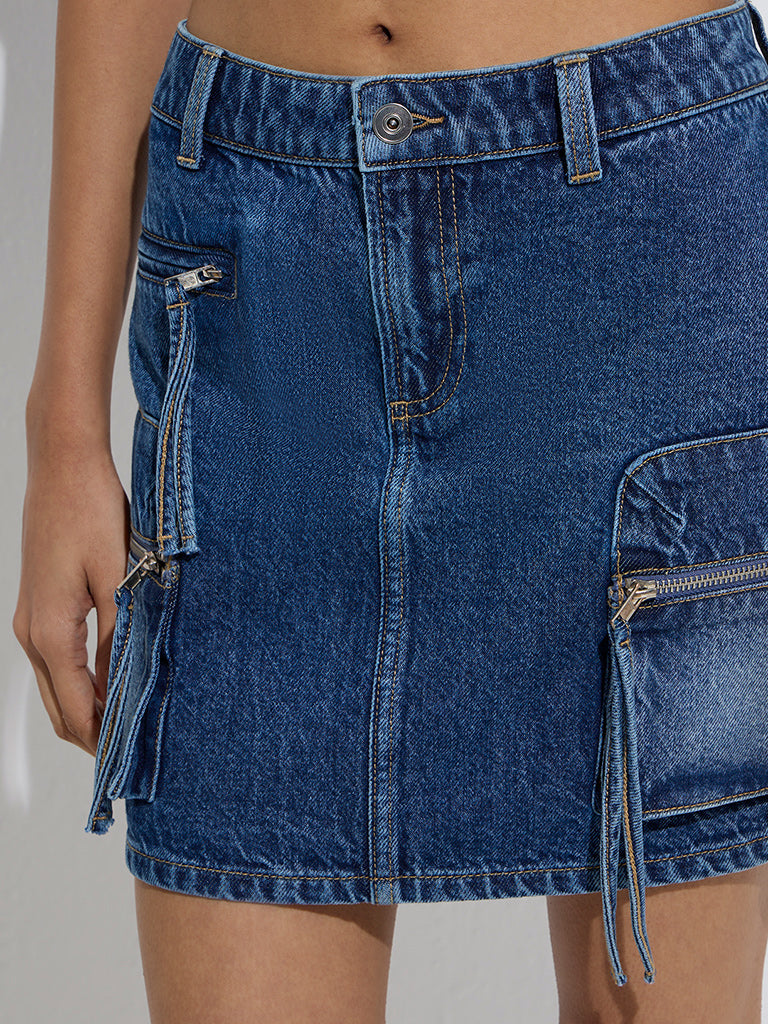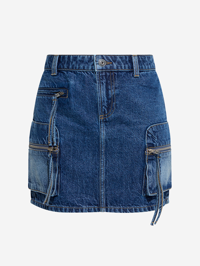 This dark blue denim skirt from Nuon is constructed from pure cotton with a washed finish for a laid-back look. Designed with belt loops and a zipper fly with button closure. it offers a structured fit. Finished with statement utility pockets. it brings a street-style edge to casual edits.
