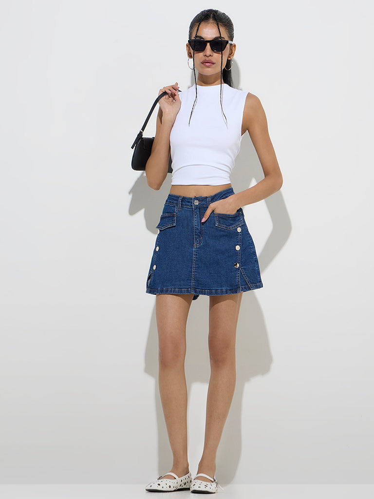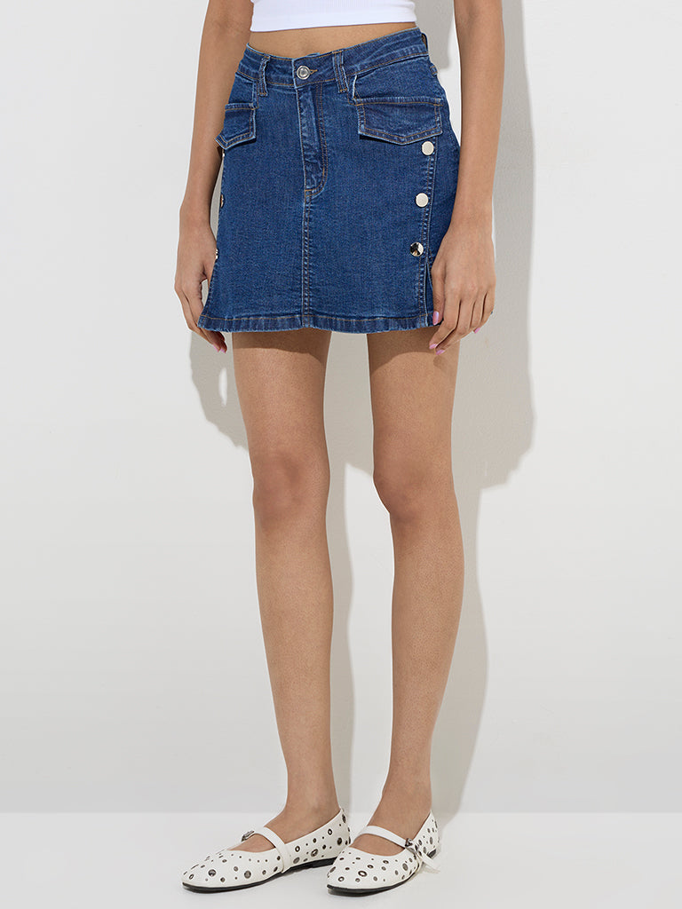 Nuon brings a modern edge to your wardrobe with this dark blue denim skirt. Crafted from pure cotton. it comes with a buttoned waistband. zipper fly. belt loops. and multiple pockets for a classic yet stylish finish.