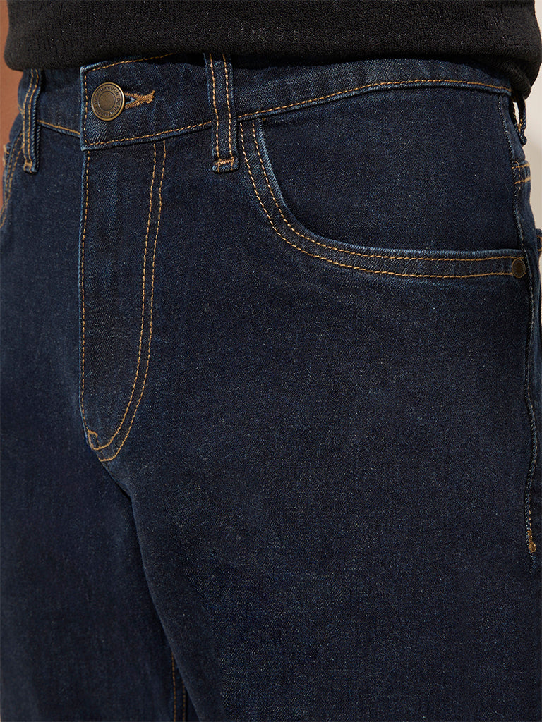 Nail the classic yet chic look with Nuon dark blue full-length jeans. boasting a timeless mid-rise fit and convenient pockets. Navigate effortlessly through seasons in these solid denim jeans. featuring a flattering straight-leg cut that pairs perfectly with a light-colored t-shirt or snug sweatshirt for cozy winter ensembles.