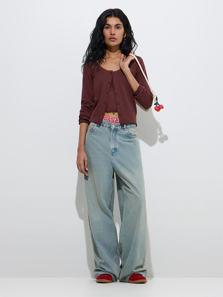 This dark brown top from Nuon boasts a V-neck accented with lace detailing for a feminine touch. Made from a cotton-rich fabric. it ensures comfort through the day. Full sleeves and a button placket add structure. while the matching inner with ruched detailing on the bodice brings texture and visual interest.
