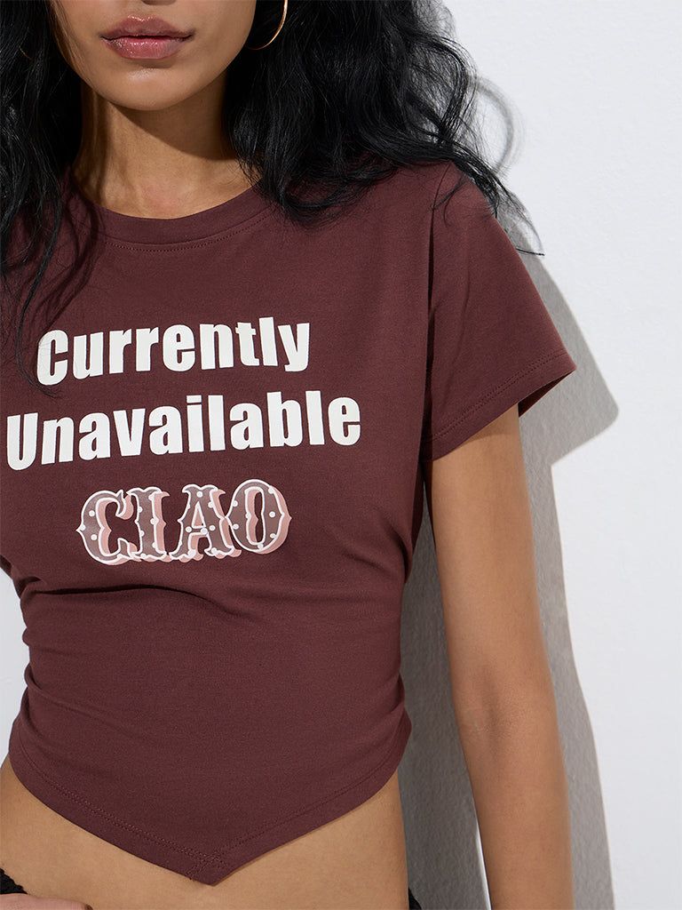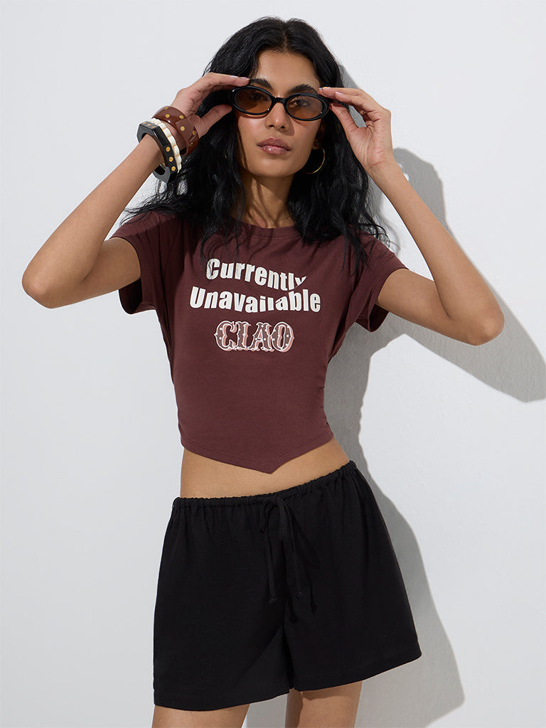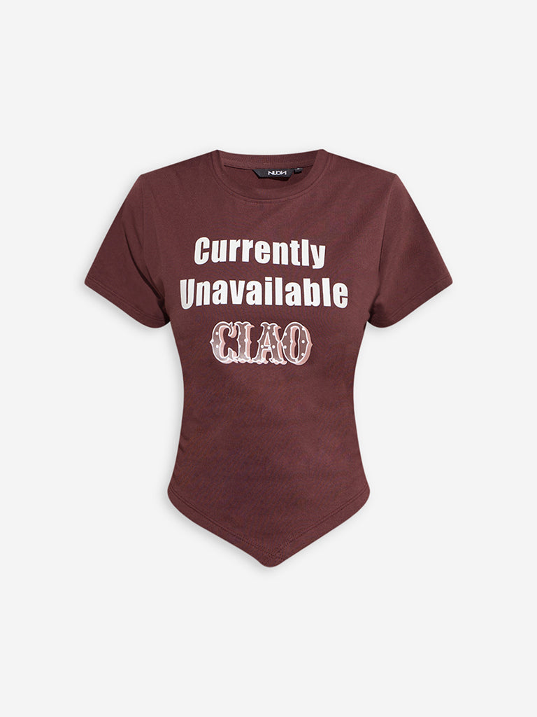Nuon Dark Brown Text Design Cotton-Blend T-Shirt