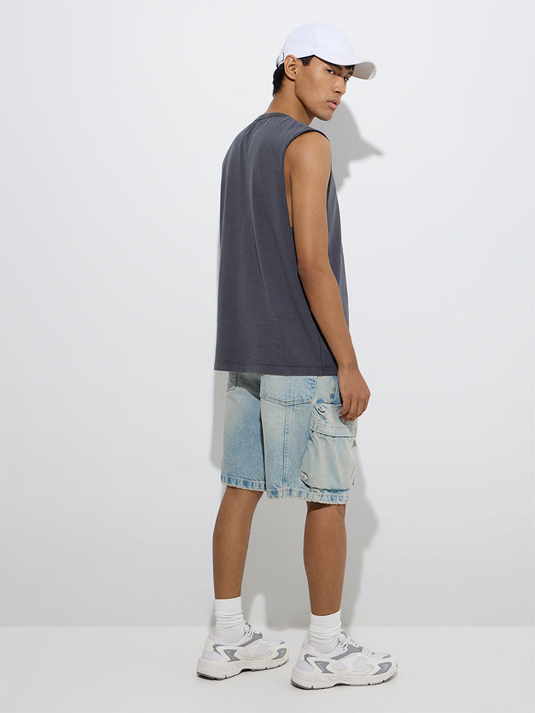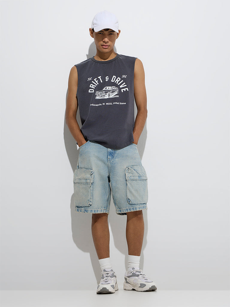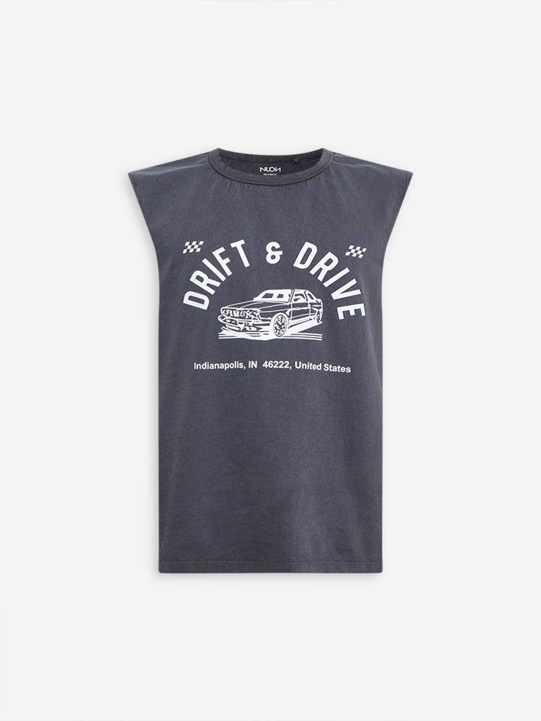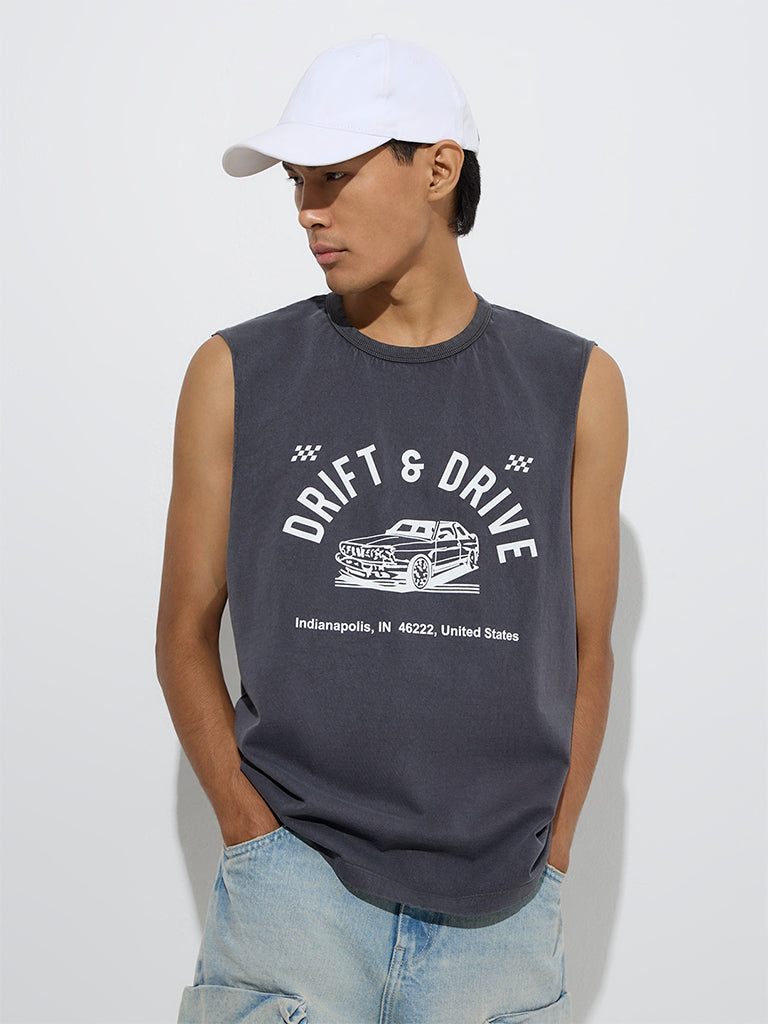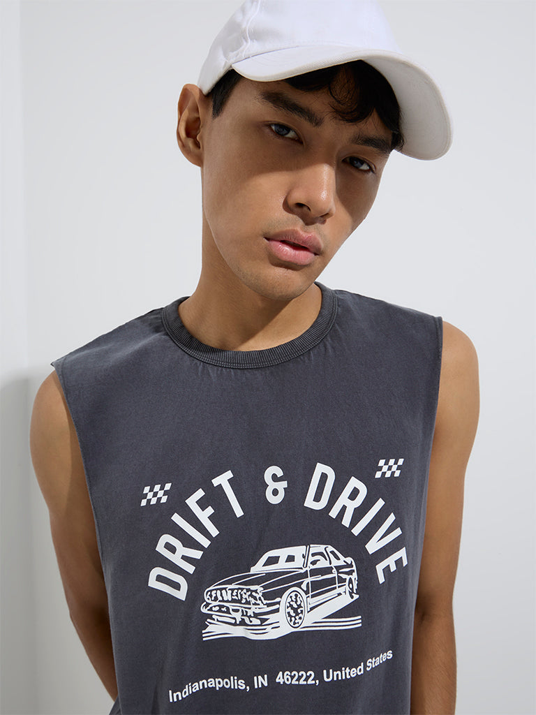This dark grey t-shirt from Nuon taps into race-inspired street style with bold text prints across the front. Cut from pure cotton in a slim-fit silhouette. it is finished with a round neck and sleeveless cut for a breezy look.