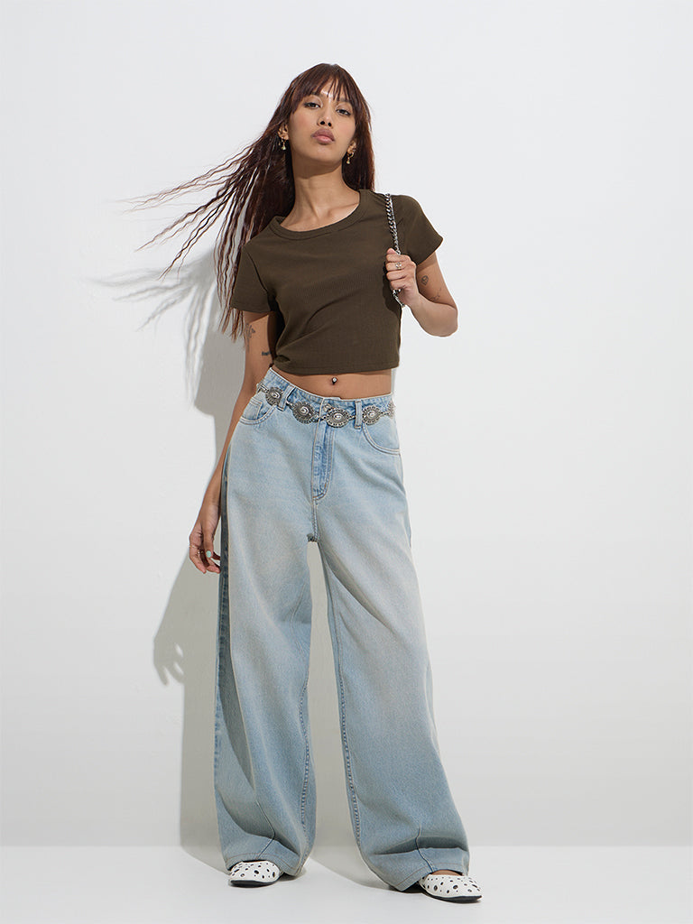 This dark olive crop t-shirt from Nuon features a striking cut-out detail at the back with sleek metal accents for a contemporary touch. Created from a ribbed-textured fabric. it offers a structured yet comfortable fit. complete with a classic round neck and short sleeves.