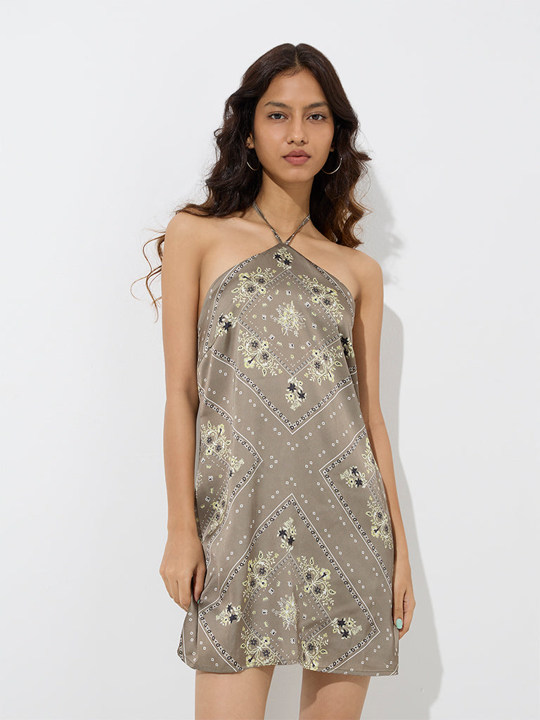 This khaki A-line dress from Nuon blends floral and bandhani prints for a contemporary look. Crafted from a luxe satin fabric for a super-soft feel. it features a halter neck that ties up at the back. adding an elegant touch to its flowy silhouette.