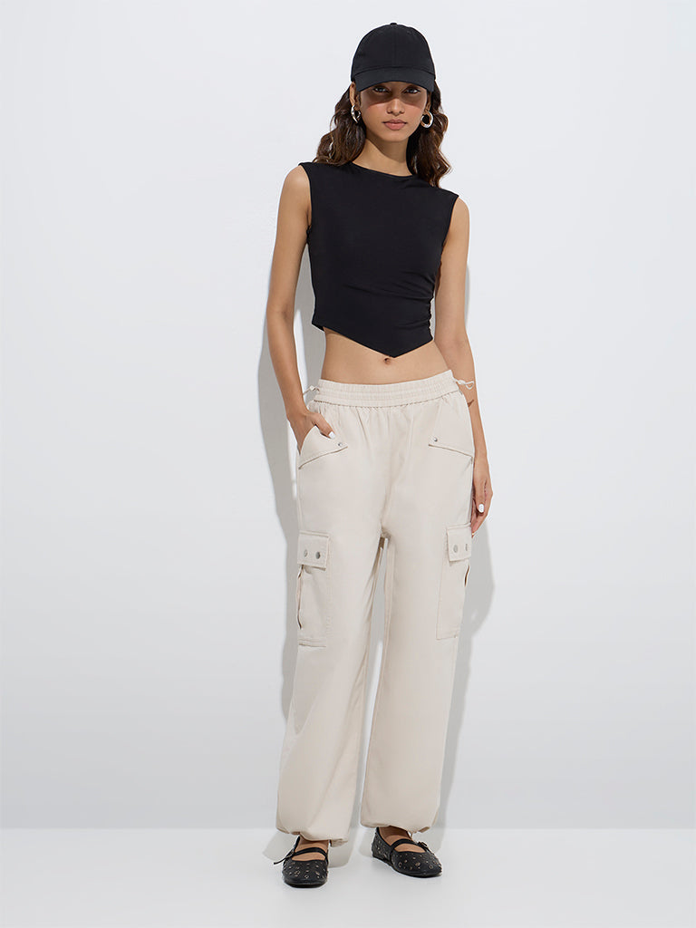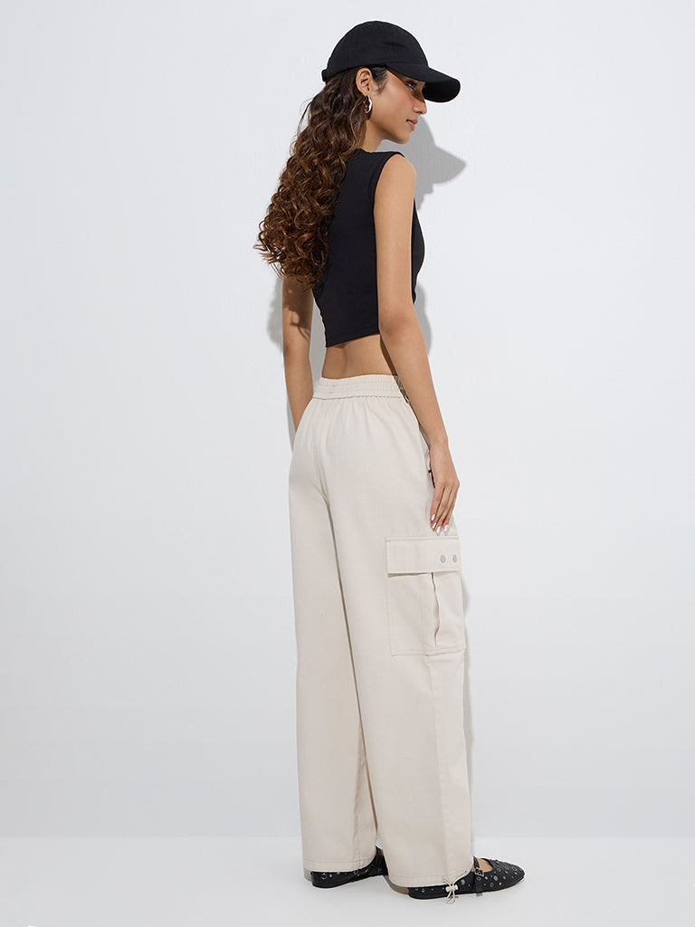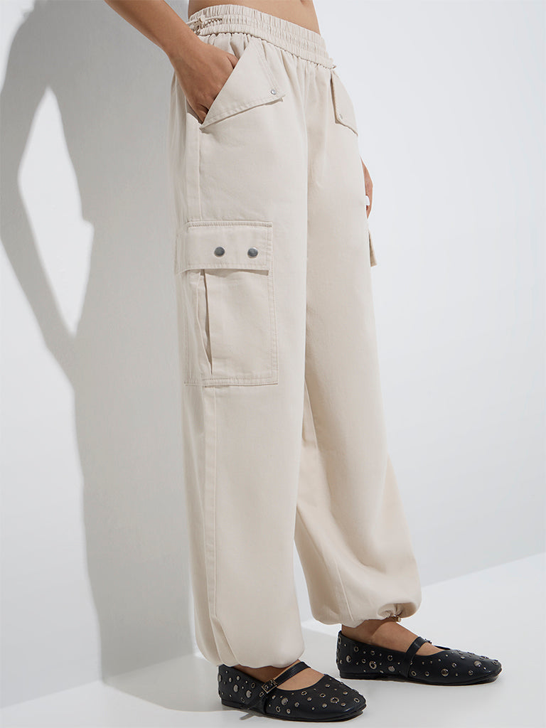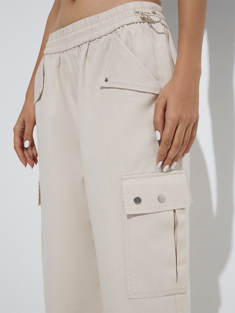 Nuon Light Beige Cargo-Style Mid-Rise Cotton Joggers