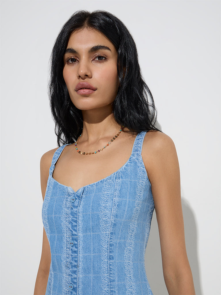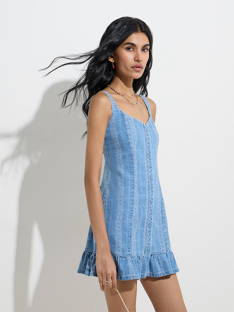 Nuon presents this light blue A-line mini dress. crafted from soft denim with tonal seam work and button detailing down the centre for a vintage touch. Designed with sleeveless shoulder straps and a scoop neckline. it skims the body gently before flowing into a ruffled hem. An easy-going piece for sunlit days and spontaneous plans.