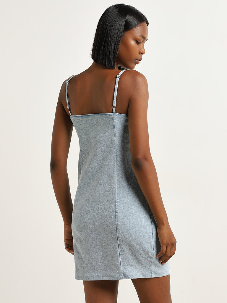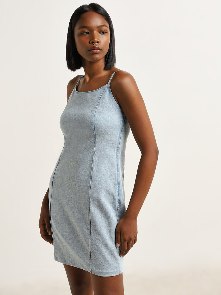 Nuon introduces this light blue bodycon dress. crafted from comfortable denim fabric. It features spaghetti straps and a scoop neckline. offering a comfortable look for any occasion.