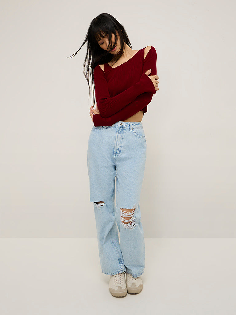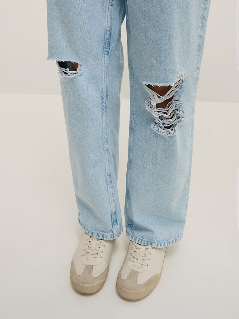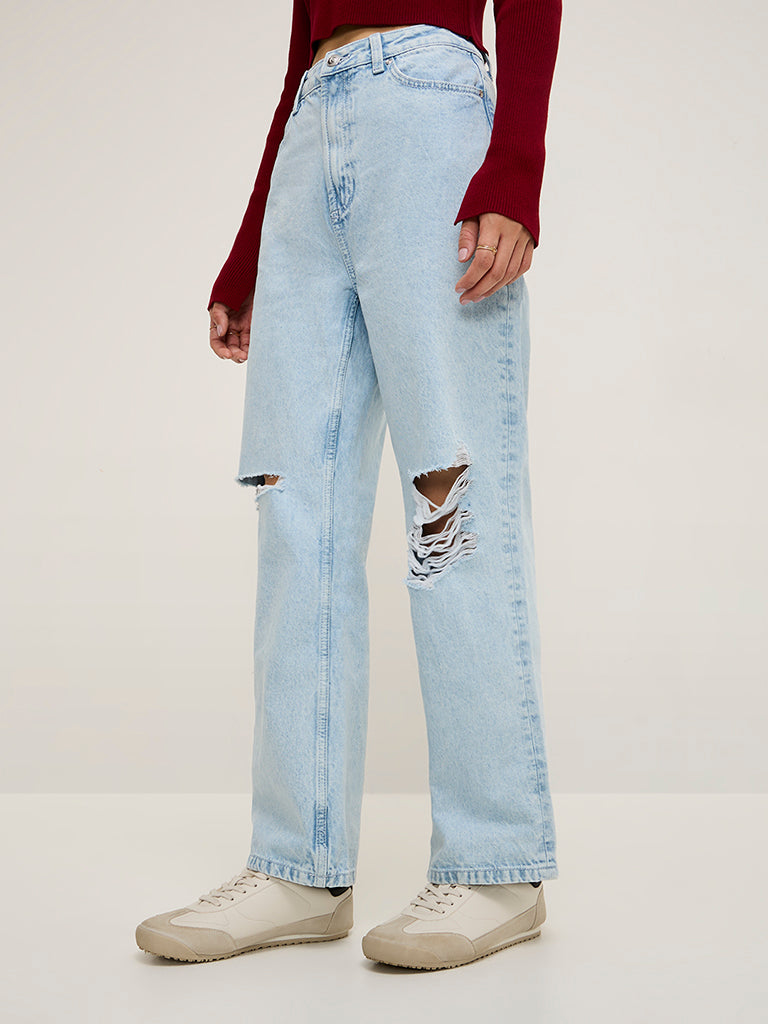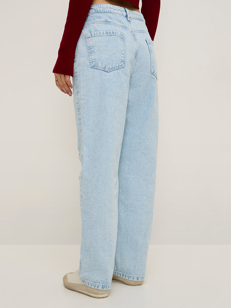 Nuon Light Blue Distressed Straight-Fit High-Rise Jeans