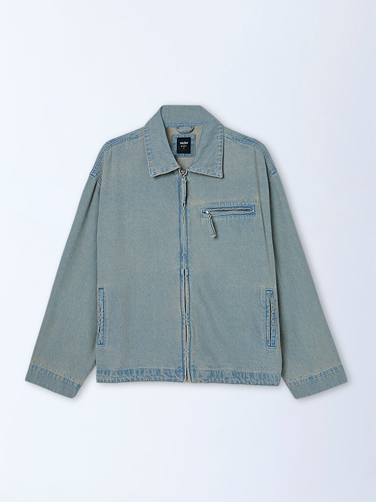 This light blue denim jacket from Nuon is an easy upgrade to everyday layering. Made from pure cotton in a relaxed silhouette. it features a collar that extends to a zipper front. full sleeves. and multiple pockets for added function.