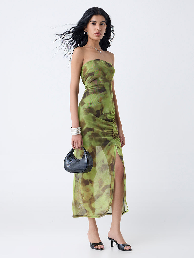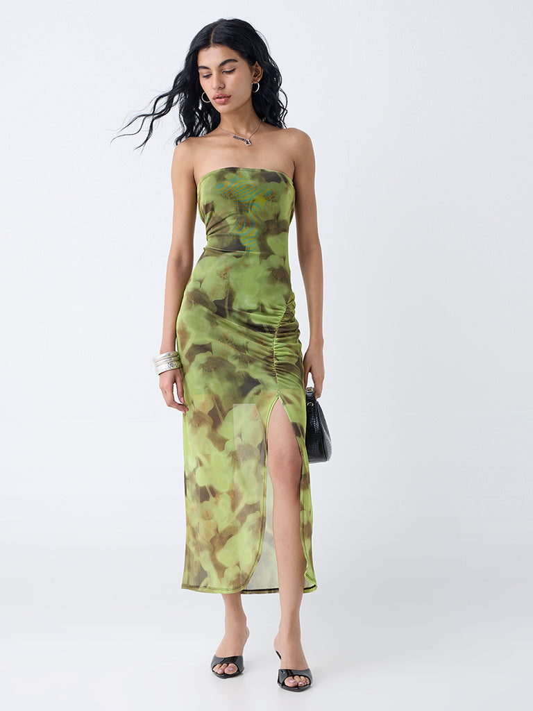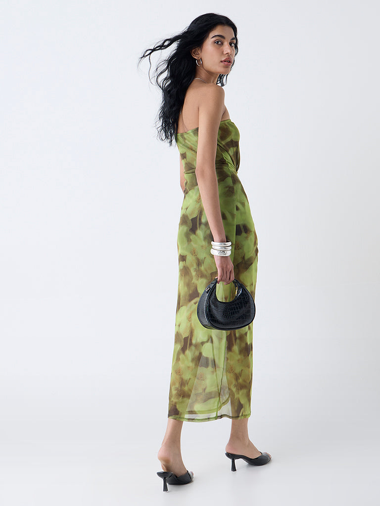Turn heads at brunches or evening outings with this lime tube dress from Nuon. Adorned with a bold floral motif. it celebrates confident style while the body-hugging silhouette and off-shoulder neckline add a modern edge.