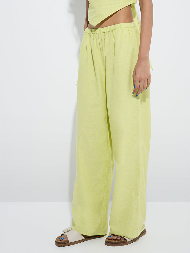 Nuon brings these lime pants. tailored in a high-rise silhouette from cotton-linen blend fabric. Fitted with an elastic waist. this pair of bottoms are perfect for effortless casual styling.