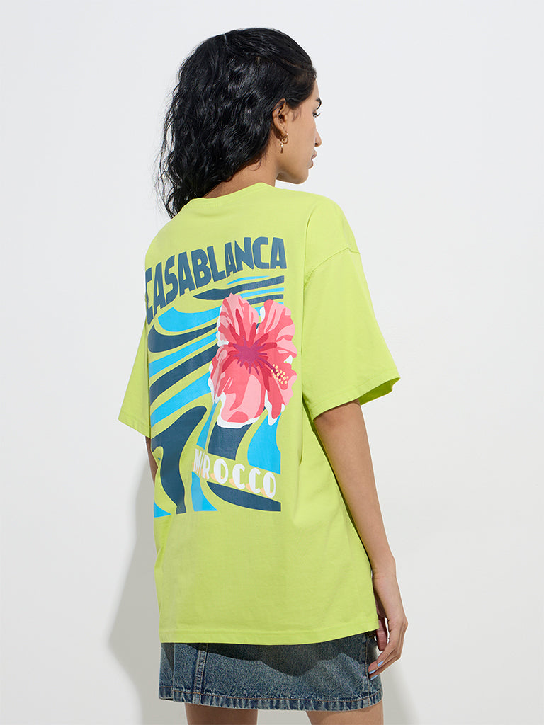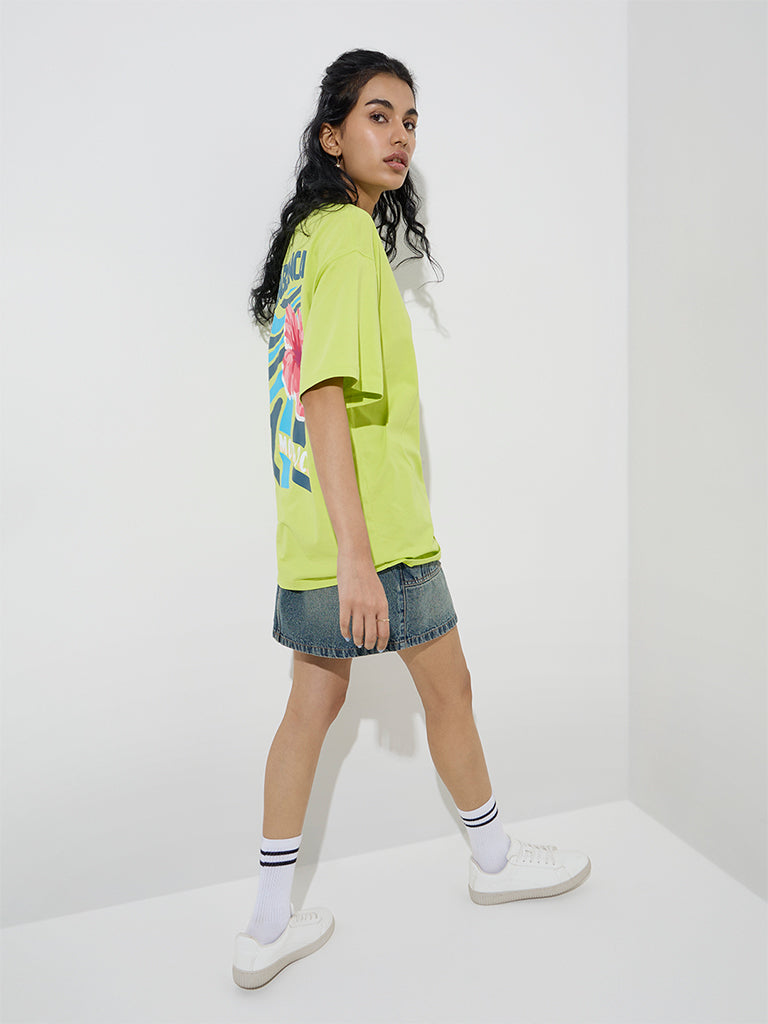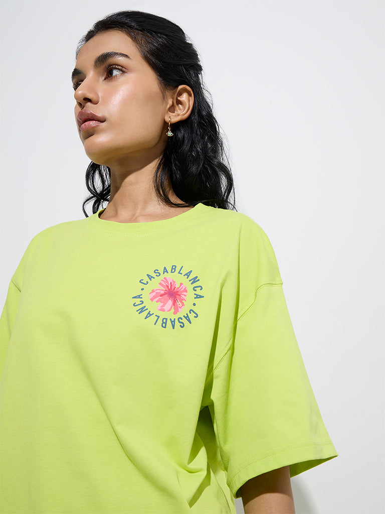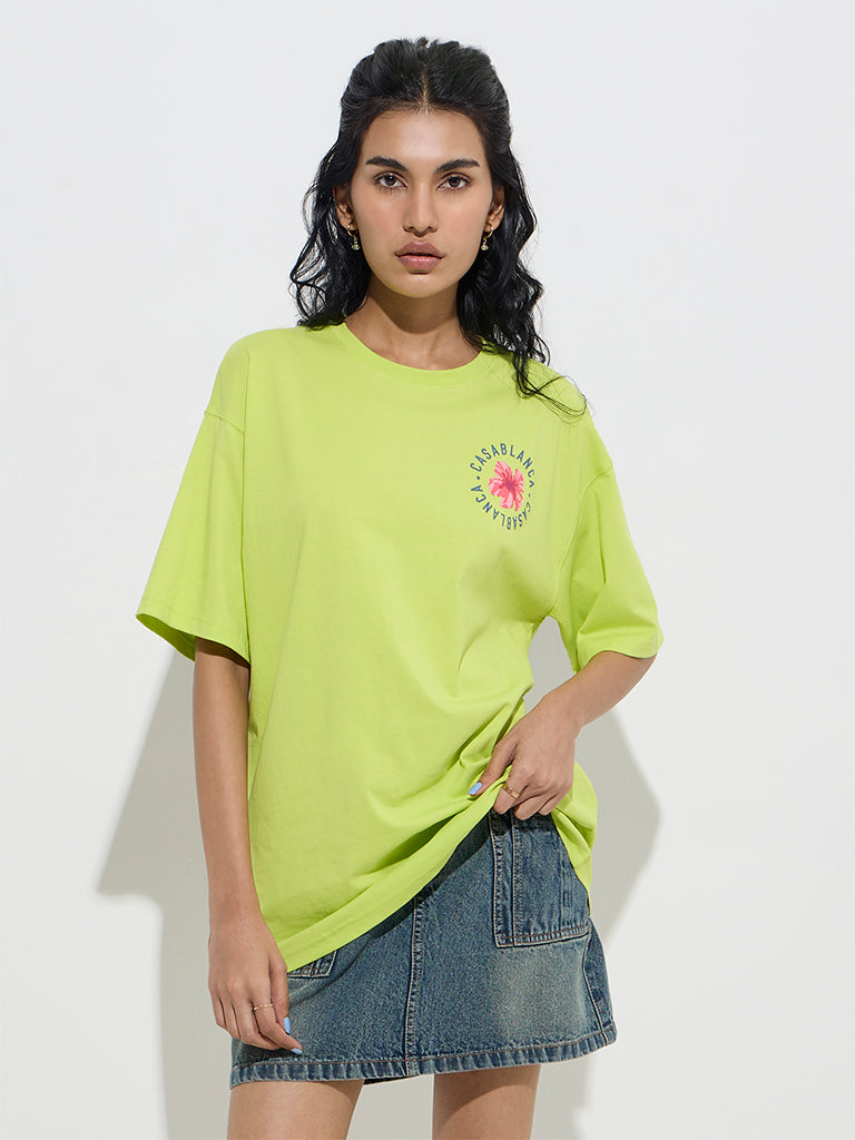 This lime t-shirt from Nuon blends floral and text elements for a stylish. contemporary edge. Crafted from pure cotton for a soft. breathable feel. it features a classic crew neck and relaxed dropped sleeves.