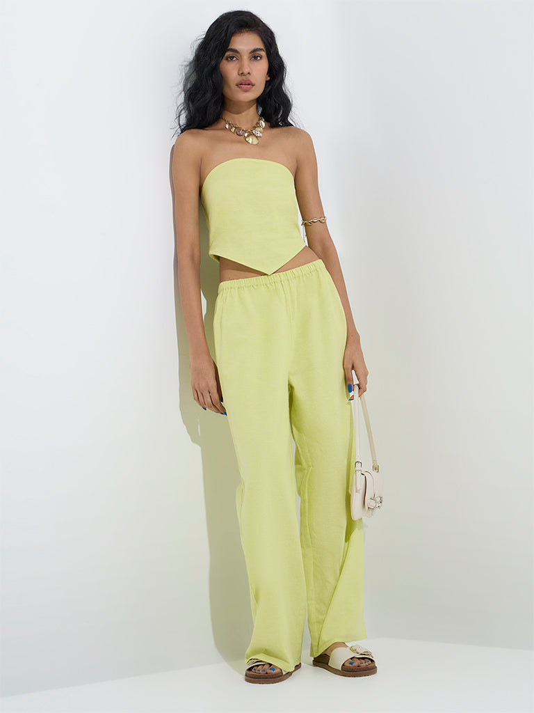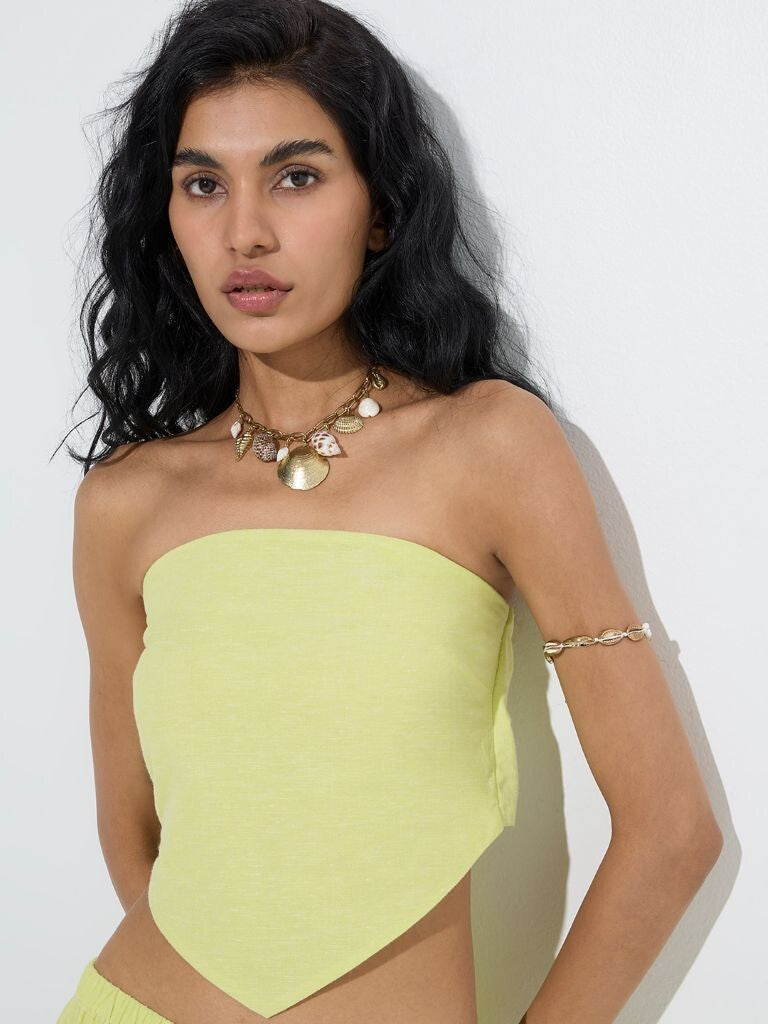 Nuon introduces this lime top. milled from a cotton-blend fabric in a vibrant hue. Designed with a corset-style waist for a flattering fit. it features a smocked back for added flexibility and comfort. A delicate tie-up detail enhances the back. blending form with function.