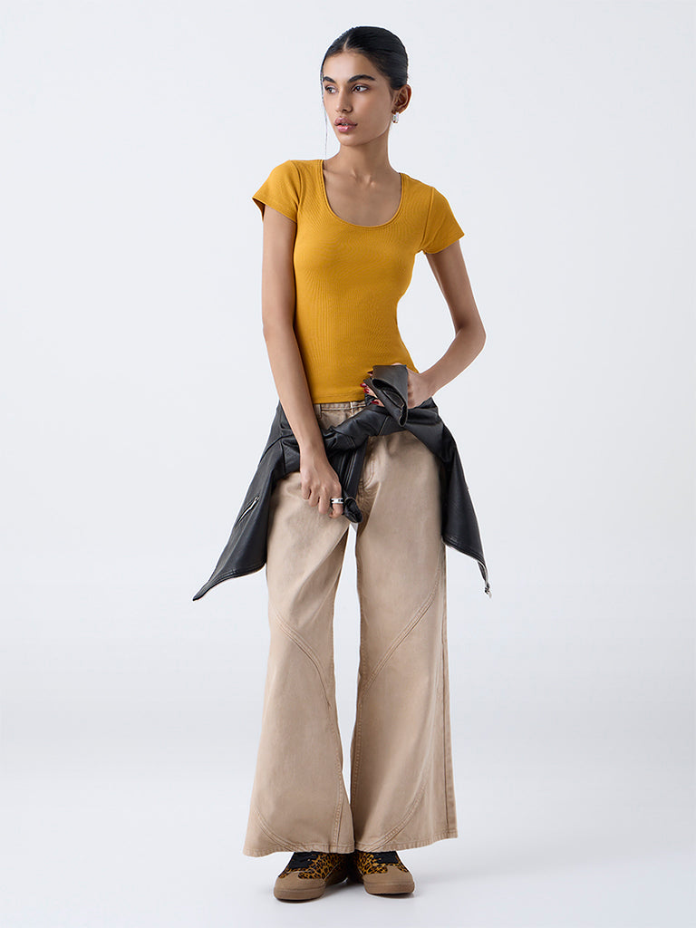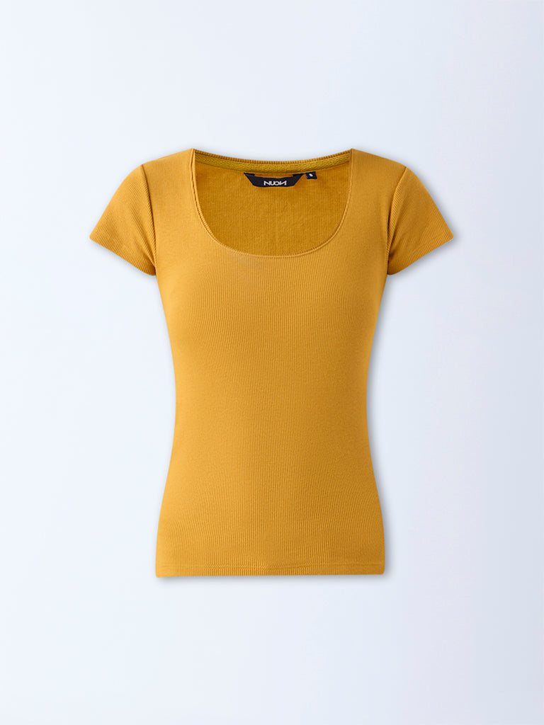 Elevate your casual essentials with this mustard t-shirt from Nuon. Designed with a scoop neck and short sleeves. it’s crafted from a sumptuous blend fabric with a ribbed texture that flatters the frame. A sleek addition to your everyday lineup.