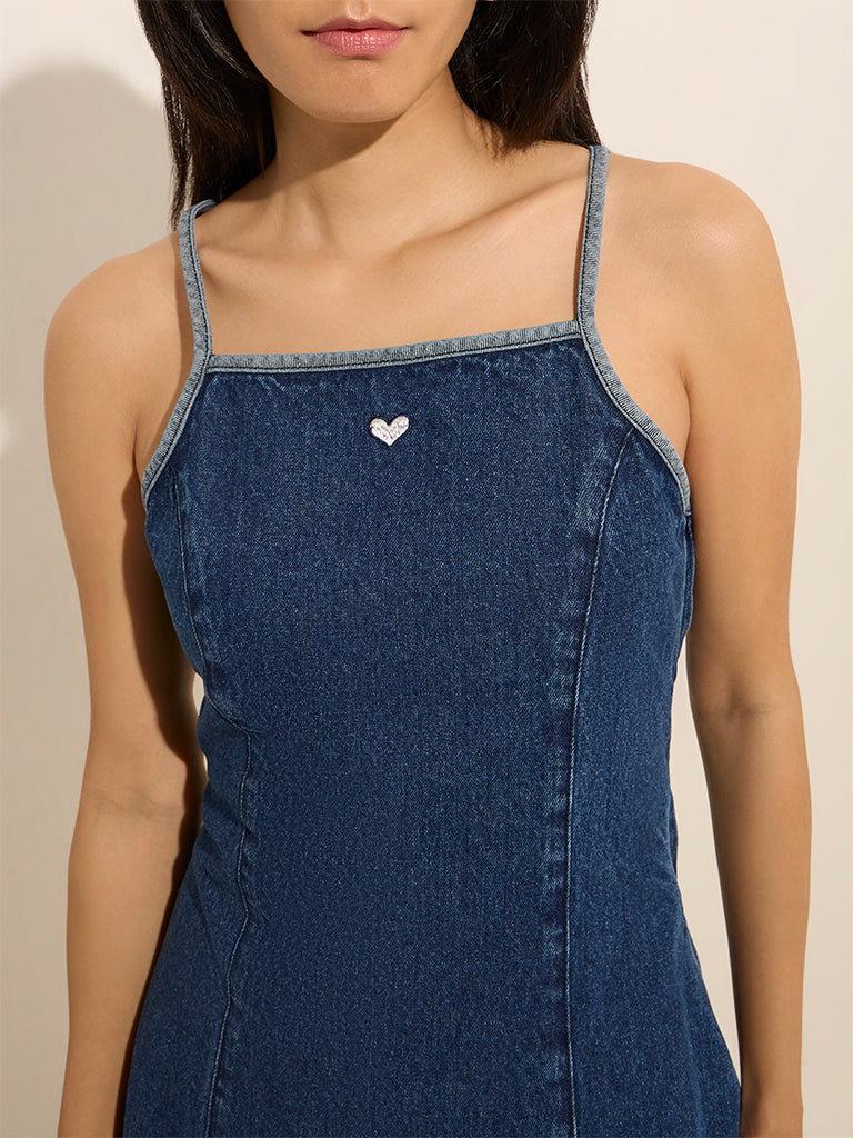 This navy denim dress by Nuon is designed with an adorable heart embroidery and seam design. Offering an A-line silhouette. the pure cotton garment carries a square neck and a sleeveless cut.