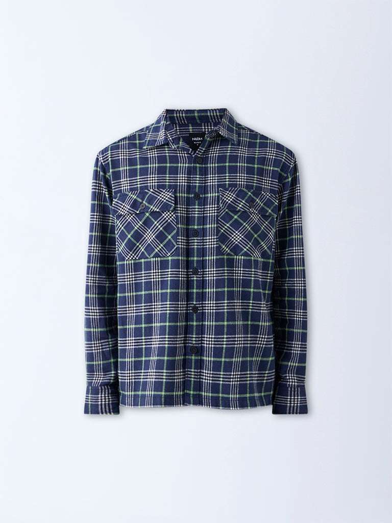 Nuon launches this navy checkered shirt. tailored from soft cotton for a laid-back yet structured look. Shaped in a relaxed handle. it features a spread collar. a button-down front. full sleeves. and two flap pockets that lend a subtle utility edge.
