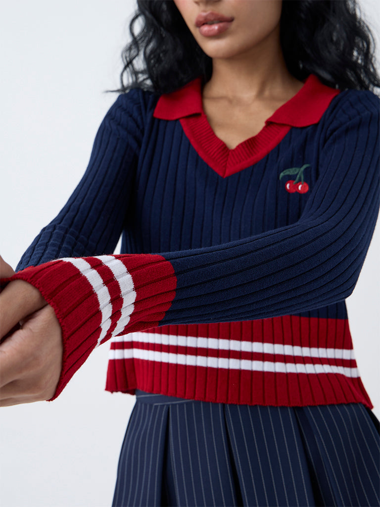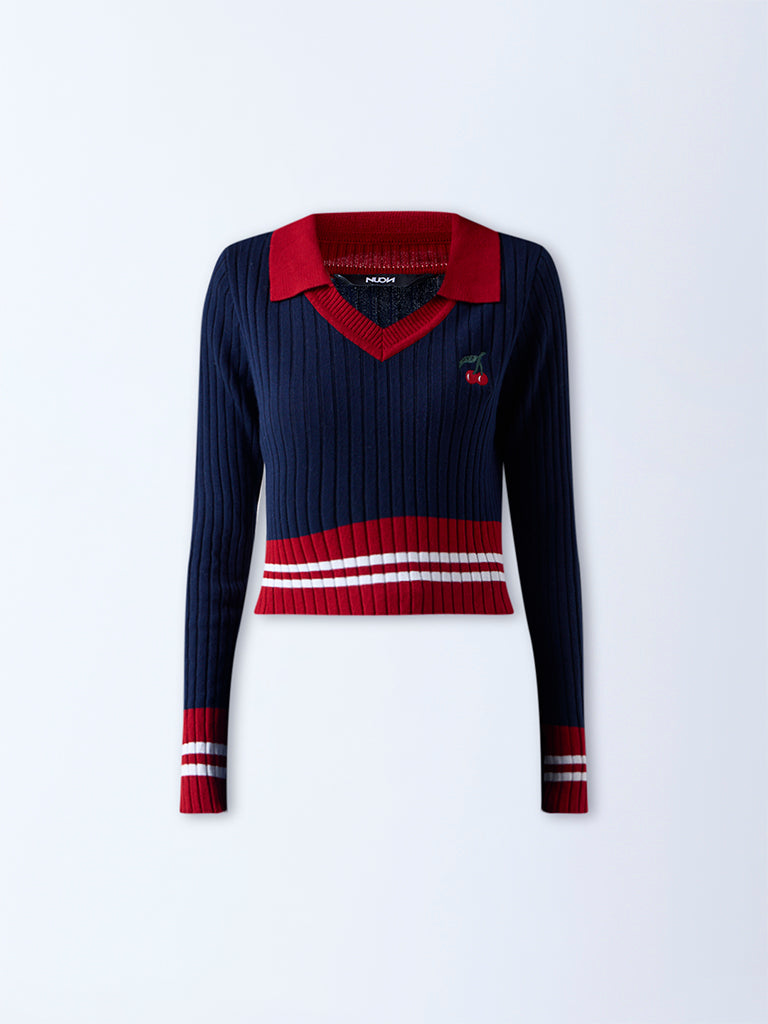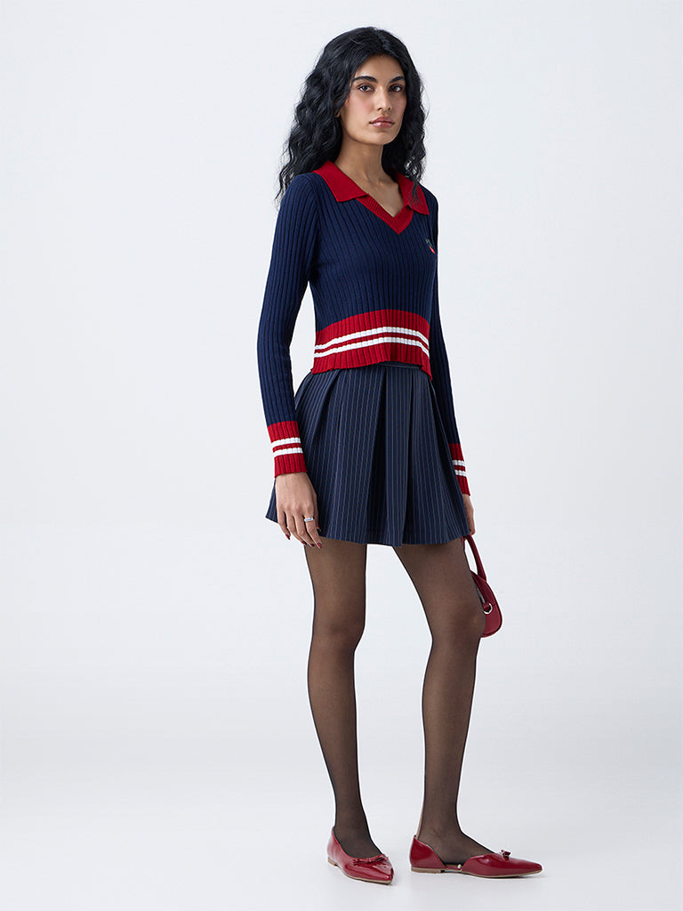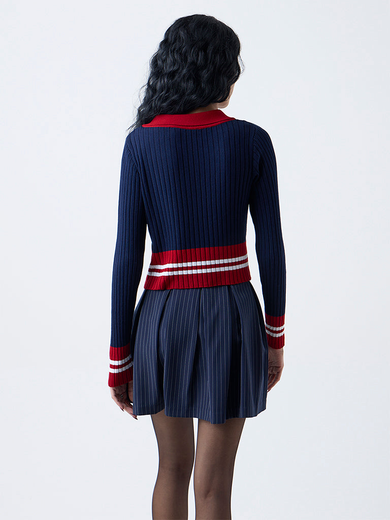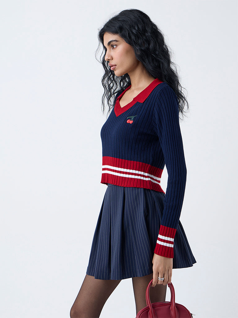 Nuon brings a sporty edge to everyday style with this navy colour block top. Crafted from a soft. warm fabric. it features a V-neck collar and full sleeves for a cozy yet polished look. The striped pattern adds a touch of contrast. making it a perfect pick for relaxed. transitional dressing.