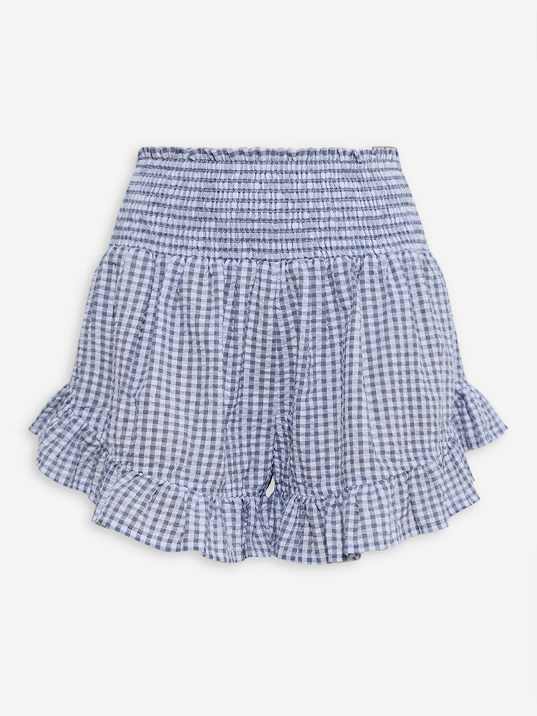 These navy shorts from Nuon are defined with classic gingham checks on a textured cotton-blend fabric for a breezy summer aesthetic. Designed with a smocked elasticated waist for a flattering fit. they are accented with delicate ruffles along the hem—lending a playful. feminine touch to this warm-weather essential.