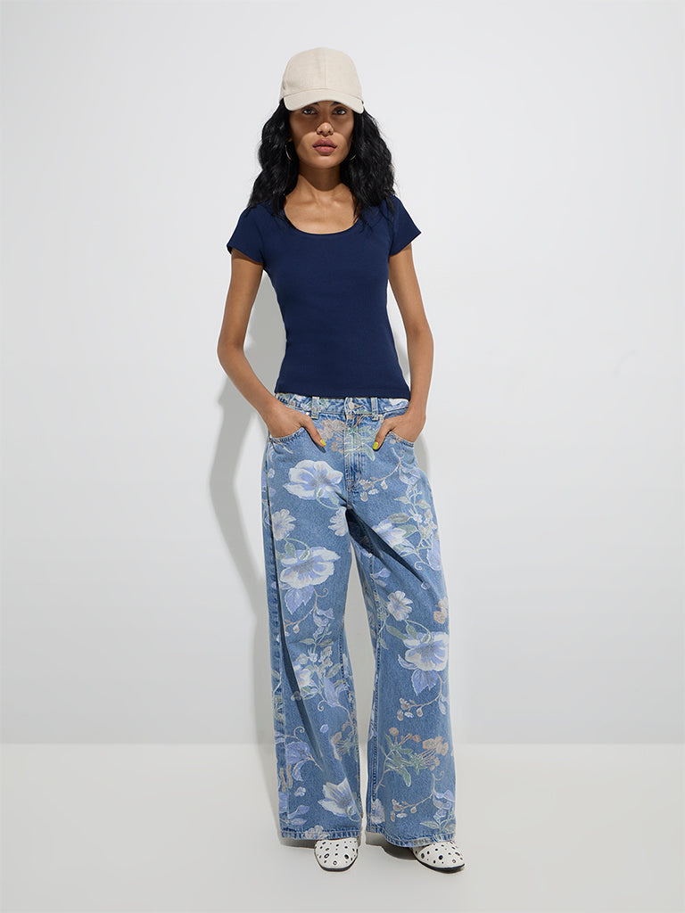 This navy t-shirt from Nuon is made from a ribbed-textured fabric that feels soft and easy against the skin. Designed with a scoop neck and short sleeves. it offers a snug fit that keeps things casual yet put-together.