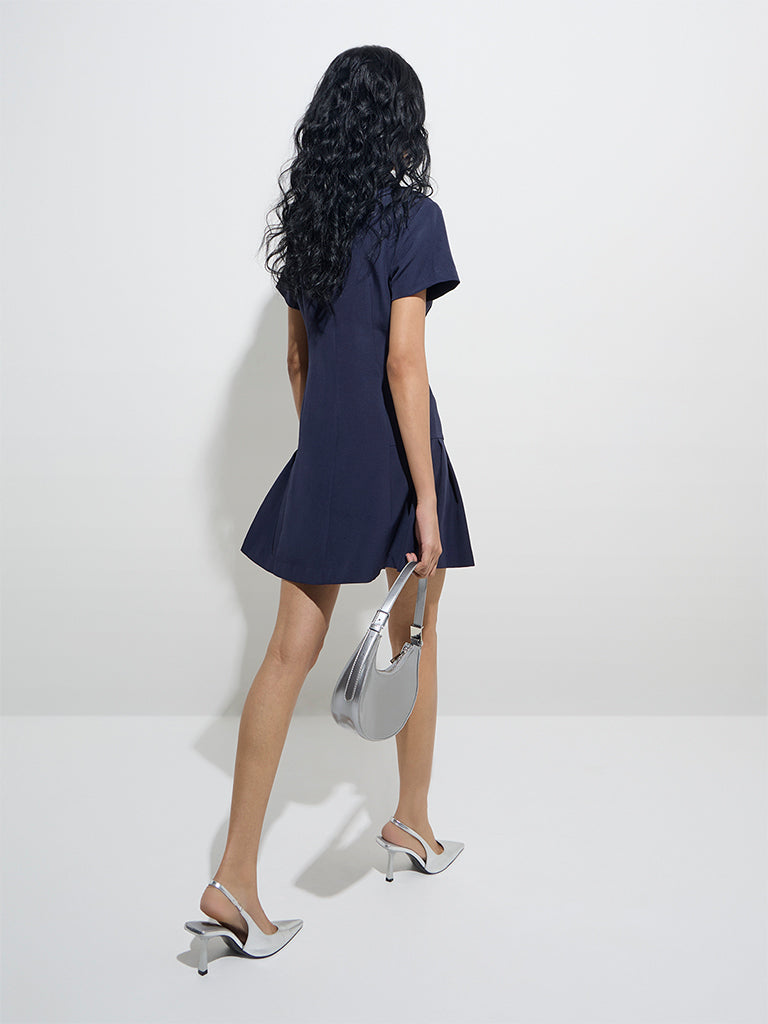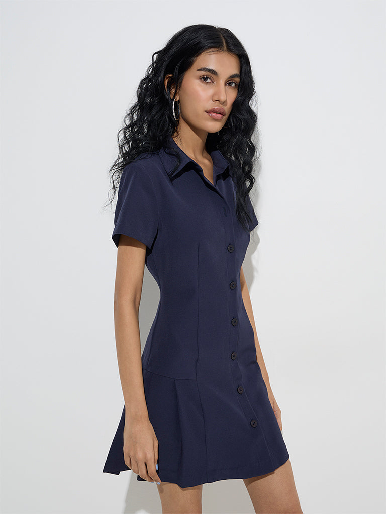 This navy shirt dress from Nuon showcases a drop-waist silhouette and neatly pressed pleats for a structured finish. Crafted from a breathable fabric. it’s designed with a classic collar that extends to a button placket and short sleeves. making it a versatile addition to your wardrobe.
