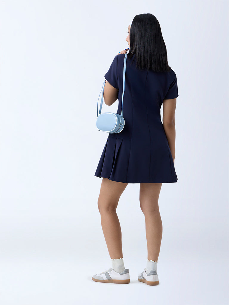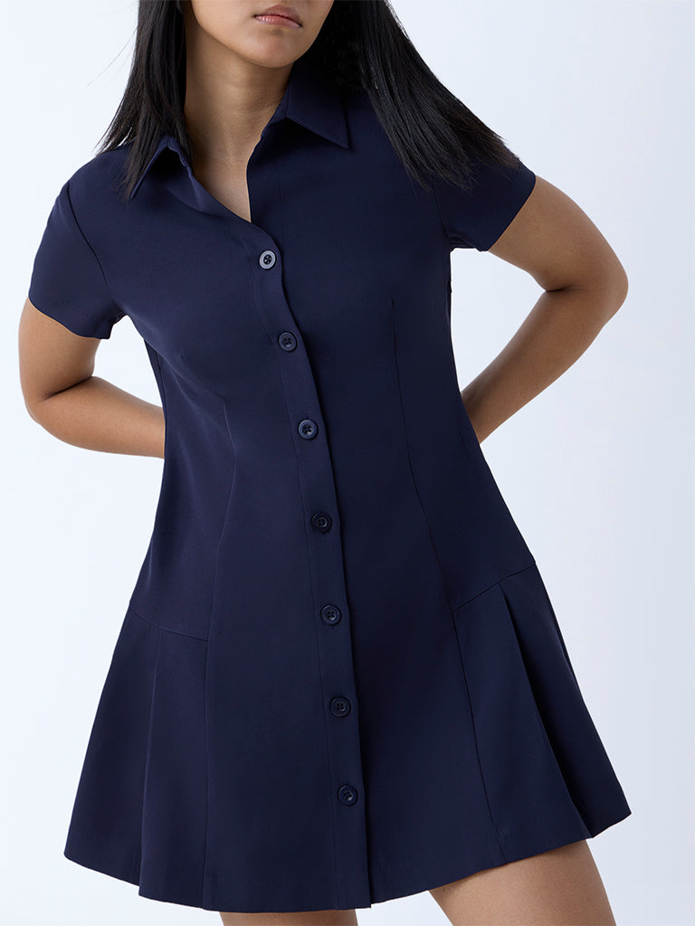 This navy shirt dress from Nuon channels effortless structure with its A-Line silhouette and tailored detailing. Made from a lightweight fabric for superior comfort. it features a classic collar. a button-up front. and short sleeves.