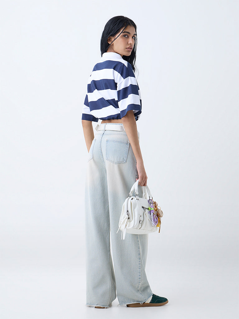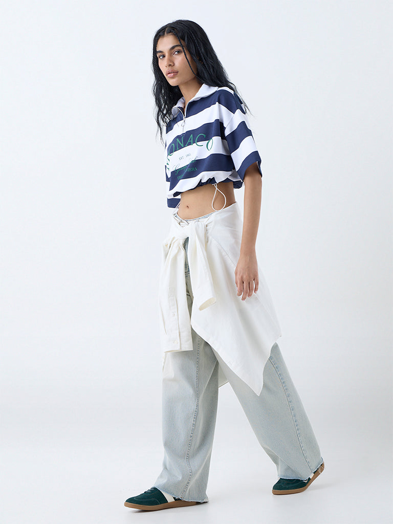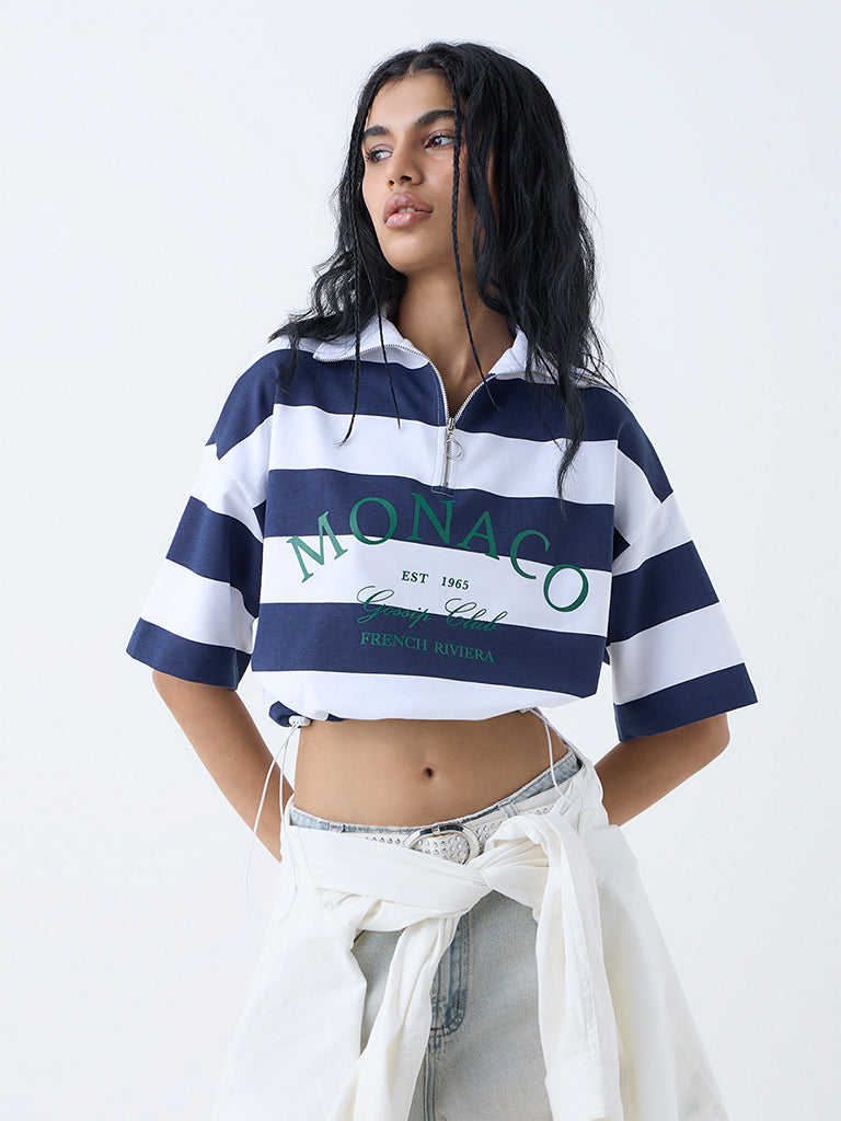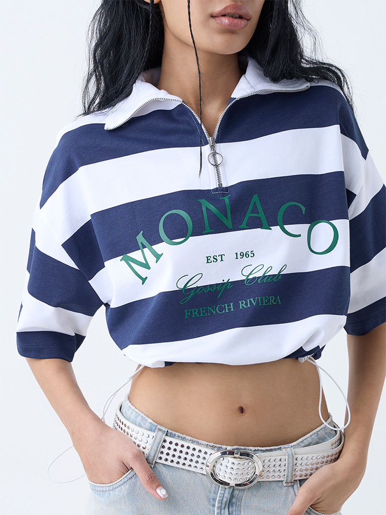 Bring sporty sophistication to your off-duty edit with this navy striped t-shirt from Nuon. Milled from pure cotton for ultimate comfort. it features a high-neck secured with a zip closure for a modern twist. Dropped sleeves and bold text prints inject an athletic edge. while drawstring detailing at the waistband allows for a customised fit.