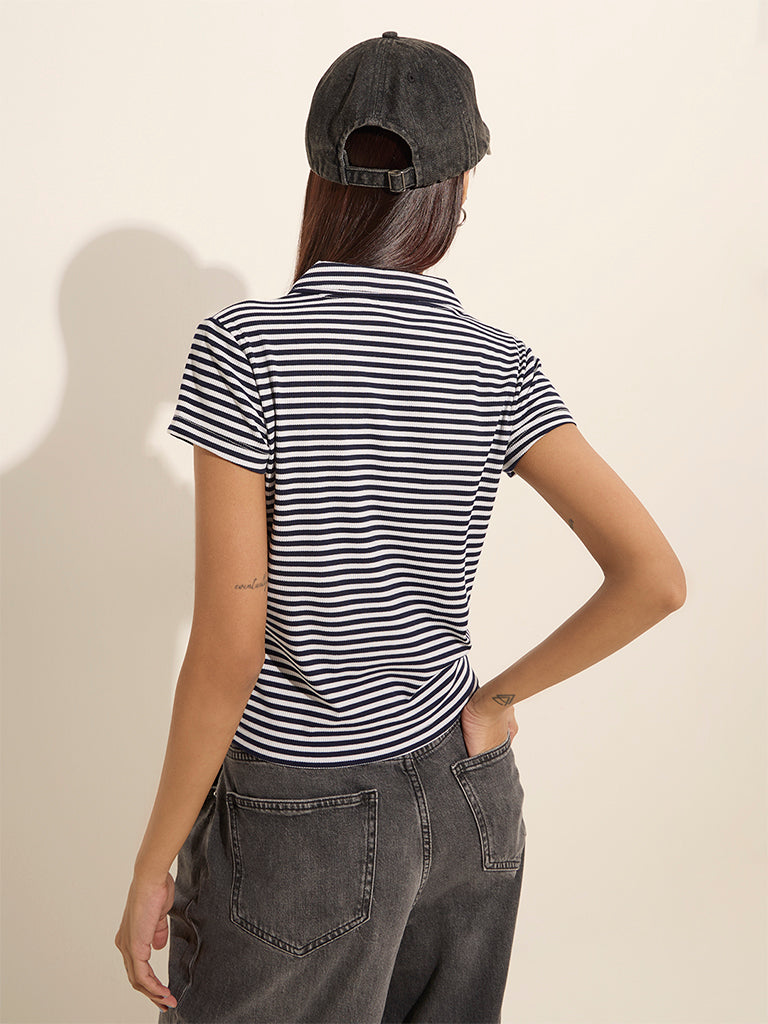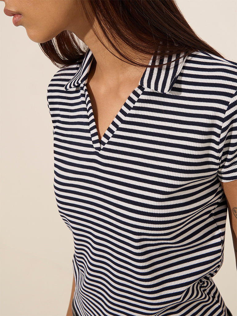 Nuon presents this navy blue t-shirt with stripes in a ribbed profile. The quality fabric garment includes carries a spread collar and short sleeves.