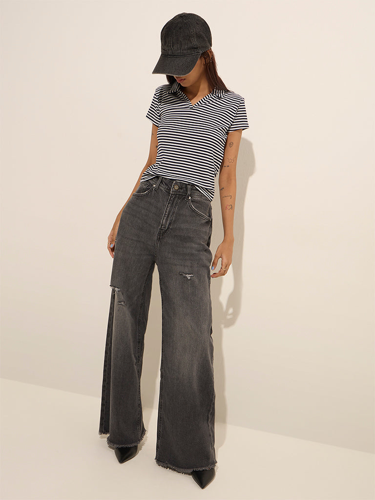 Nuon Navy Striped Ribbed-Textured Cotton-Blend T-Shirt